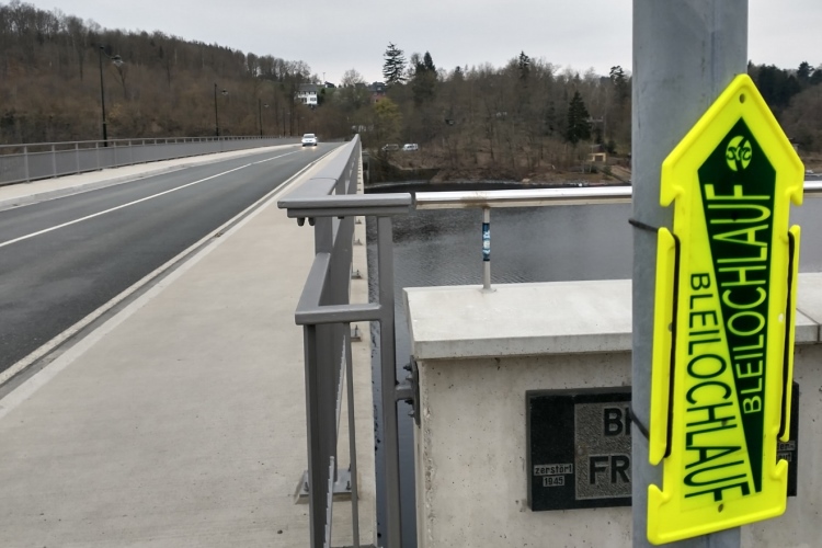 Ich verlasse den Wald und laufe höchst vorsichtig den Pfad hinunter durch eine Streuobstwiese. Langsam und mit Bedacht erreiche ich dann die Eisbrücke, auf der die Landesstraße L1101 über die Talsperre führt. Vor der Brücke weist die gelbe Markierung nach links. Ein entsprechendes Schild verbietet den Fußgängern die Wegbenutzung. Jetzt kommt das Zuckerl, denn die Galerie (ein Hängesteig) unterhalb des Koberfelsens kann nicht benutzt werden. Ein Steinschlag im letzten Jahr hat die Galerie teilweise zerstört. Uns führt ein übler Weg hoch, laufen ist unmöglich. Wer es probieren möchte, würde sich durch die unzähligen Äste und Zweige selbst den Fuß legen. Hier schaut es so aus, als ob ein Sturm den Baumbestand platt gemacht hat. Meter für Meter kämpfe ich mich schnaufend die 100 Höhenmeter nach oben. Später werde ich auf der App sehen, dass ich für den 37. Kilometer über zwölf Minuten gebraucht habe.
