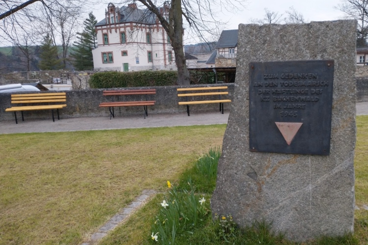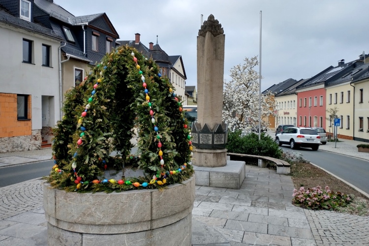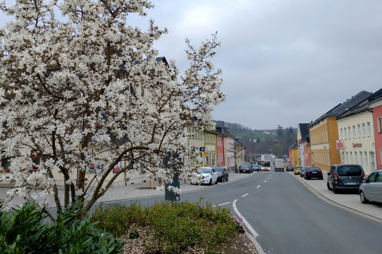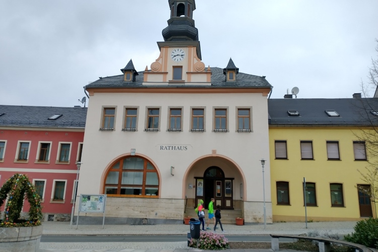 Wir laufen hinunter zum großen Parkplatz am Sportplatz und dann führt uns die Schleizer Straße hinunter zum Markt der 4000 Einwohner zählenden Stadt. Der Gehweg fordert aufgrund des Pflasters schon etwas Aufmerksamkeit. Einige Asphaltjunkies laufen auf der Straße, die jedoch nicht gesperrt ist. Verkehr ist aber jetzt um die Zeit kaum unterwegs. In einer Nebenstraße können wir nur kurz einen Blick auf die evangelische Kirche St. Marien erheischen, die im 13. Jahrhundert erbaut wurde. Rechterhand grüßt das Rathaus.