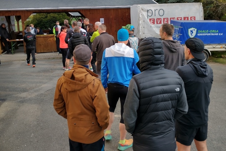 Viele Zuschauer werden wir heute nicht zu Gesicht bekommen, auch vor dem Rathaus stehen kaum Leute, um unser Treiben zu begutachten. Um Zuschauer geht es uns aber nicht, denn gleich nach dem Überqueren der Brücke des Friedens verlassen wir Saalburg und tauchen in die Natur ein. Der Asphalt endet und schon nach ein paar Augenblicken verjüngt sich der Kurs wie ein Flaschenhals. Das Ergebnis, Stau. Im Stop-and-Go geht es einen Hang hinauf. Dann können wir wieder auf breitem und gutem Feldweg Fahrt aufnehmen. Doch das ist nur von kurzer Dauer, wir laufen wieder an den Bleilochstausee heran. Die Stimmung im Feld ist gut, es wird über Gott und die Welt gequasselt wie bei Sven und Tanja, die vor mir laufen. Tanja hat mit Jens und mir im Februar ein Team beim Wintermarathon gebildet.