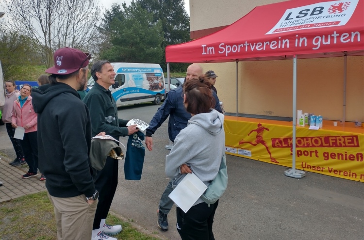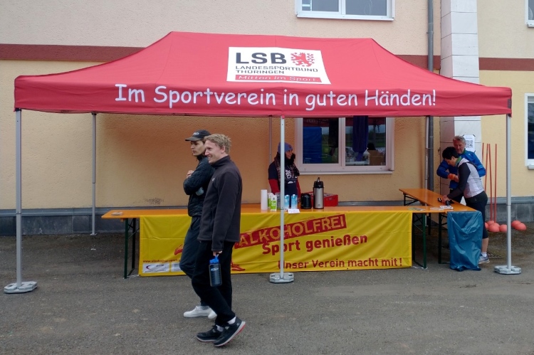 Die Meldeschalter öffnen am Lauftag um 07.30 Uhr. Nach dem Frühstück spazieren wir hoch zum Sportplatz, der gerade fünf Minuten von unserer Unterkunft entfernt ist. Dort sehe ich schon eifriges Treiben. Doch die Helfer geben Gas und nach wenigen Minuten halte ich meine Startnummer (mit Einmalchip) und das T-Shirt in der Hand. Umkleiden kann man sich im angrenzenden Sportheim. Zum Einlaufen für die, die das brauchen, dient die etwas in die Jahre gekommene Laufbahn um den Sportplatz. Ich verlege mein Aufwärmen auf die ersten zehn Kilometer, nur nichts übertreiben.
