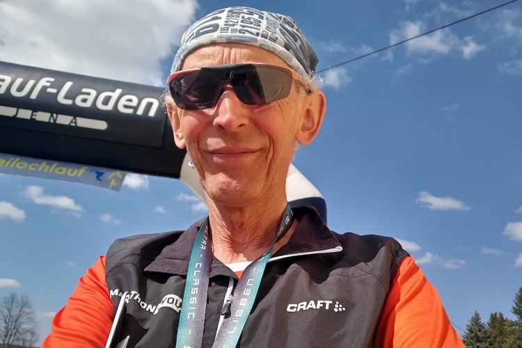 Am Dammende zur Brücke biegen wir links ab auf den Saaleradweg (403 Kilometer lang), der von der Saalequelle im Fichtelgebirge bis zur Mündung in die Elbe bei Barby (Nähe Magdeburg) führt. Leicht wellig führt er zwei, drei Kilometer dahin, dann steigt er in Rampen an, um sich dann mit 16 Prozent Steigung vom Saaletal hochzuschrauben. Ein E-Bike Fahrer überholt mich fröhlich pfeifend unter Strom und muss sich nur zwei Minuten später an der ersten Serpentine an einer Aussichtsbank japsend vor Sauerstoffnot niederlassen. Er staunt ob der wahnsinnigen Läufer, die zumindest hier im schnellen Marschschritt die rund 100 Höhenmeter bezwingen.