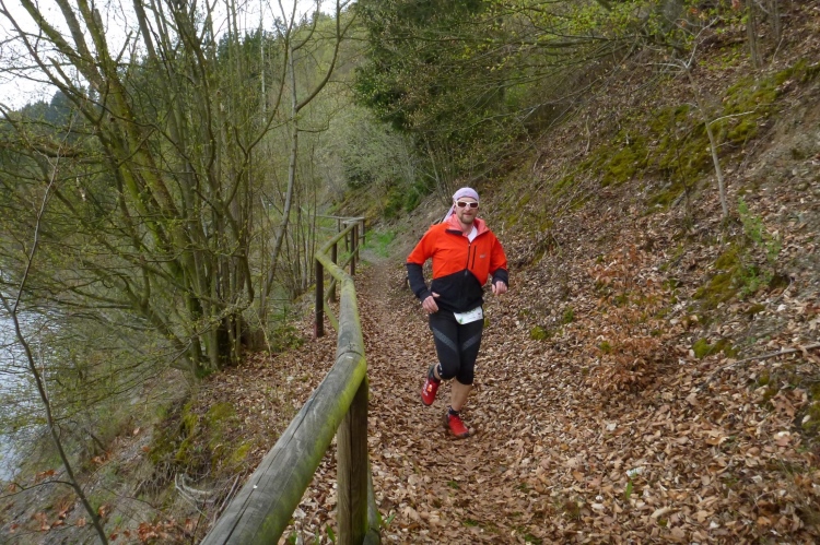 Nach ein paar weiteren Metern auf Asphalt endet dieser und wir sind in der Natur angekommen, rechts das Wasser des Stausees, links geht es hoch. Nach ein paar Minuten kommt schon meine erste Unaufmerksamkeit. Eine rustikale Holztreppe, bei der die Stufen von Eisenstangen gehalten werden. Ich bleibe zwei Mal hängen und kann gerade so noch einen Abflug vermeiden. Ich muss aufmerksamer rennen. Und wenn meine Konzentration nachlassen sollte, dann werde ich halt eine schmerzhafte Erfahrung machen.