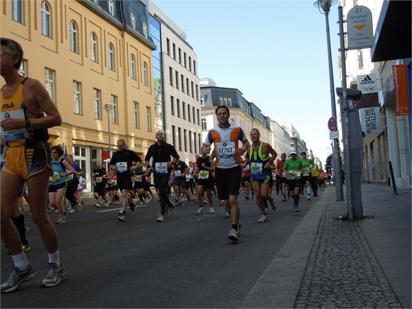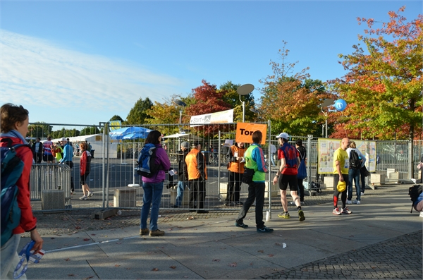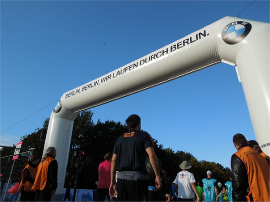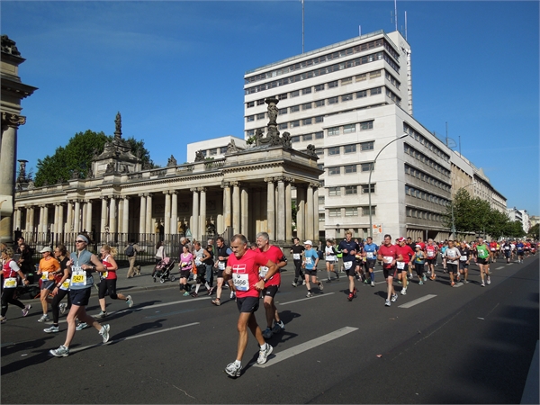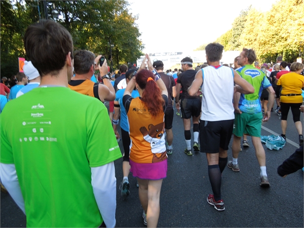 Eine riesige Menschenmasse bevölkerte den Tiergarten am Morgen des Marathon-Tages. Ich verabschiedete mich von Natascha, sowie von Andrea und Kay, die für den Skating-Marathon am Vortag angereist waren. Alle drei wünschten mir viel Erfolg und sollten im Laufe des Rennens eine große Stütze werden. Für ein störungsfreies Rennen wollten meine Mama und meine jüngste Schwester sorgen, die sich extra als Streckenposten meldeten. Ein kurzer Blick eines Sicherheitsmannes auf meine Startnummer genügte und ich bekam Einlass in den Läuferbereich. Jetzt gab es kein Weg zurück mehr und während ich mich zu meinem Startblock begab, wurde ich doch ziemlich nervös. Der Puls stieg auf 120 Schläge pro Minute. Als Marathon-Neuling ohne Zeit startete ich im letzten Startblock, dem Block H, oder wie der Moderator es beschrieb, im Startblock für alle, die nicht so auf die Uhr schauen und einfach stolz sind, diese Laufleistung zu erbringen. Das musste sich noch herausstellen.
