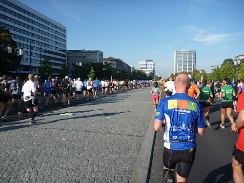 Ich tauche ein in eine Atmosphäre von mehr als 40.000 Läufern und fühle mich sauwohl. Kleiderabgabe gleich gefunden, der Weg zu meinem Startblock weit, aber entspannt. Im Tiergarten haben die Büsche auf die alljährliche Düngung nur gewartet. Männlein und Weiblein arbeiten quasi Hand-In Hand, um die Flora zu erfrischen. Auch die Blutsauger haben gewartet. In dem Gedränge ist es nicht einfach, sich der Dinger zu erwehren, sie sitzen überall auf der nackten Haut, haben wohl ihre Brutsaison diesem jährliche Ereigniss angepasst.