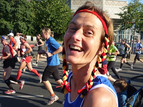 Die Spitzenläuferinnen sehe ich gar nicht, sehr viel Orange der Orgaleute. Ich werde beiseite gedrängt von panischen Kameraleuten, bekomme erklärt, dass ich mich verpissen solle, es gehe hier ja schließlich um Spitzenzeiten. Überall Elektronik für Zeitmessung und Kameras, ich solle ja nicht drauftreten. Hektik, Geschubse, ich laufe meinen 150ten und bin doch nur eine Feder in der Brandung, dann geht es ganz schnell, viel zu schnell, meine Starts sehen anders aus, die Unterernährten flitzen los als hätten sie Durchfall.