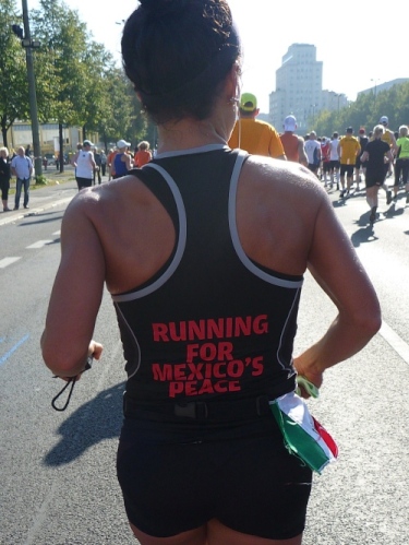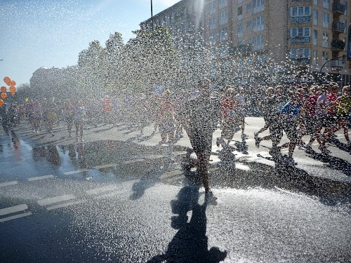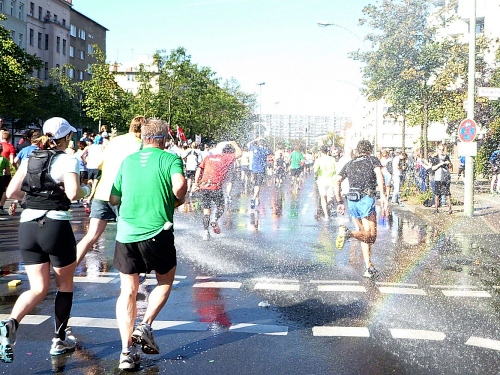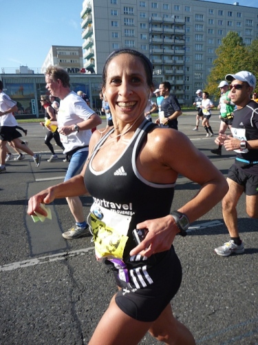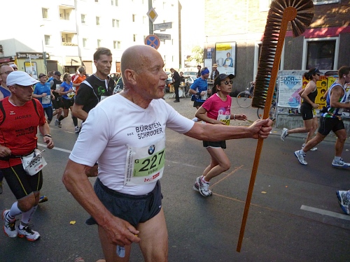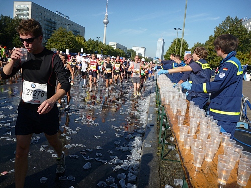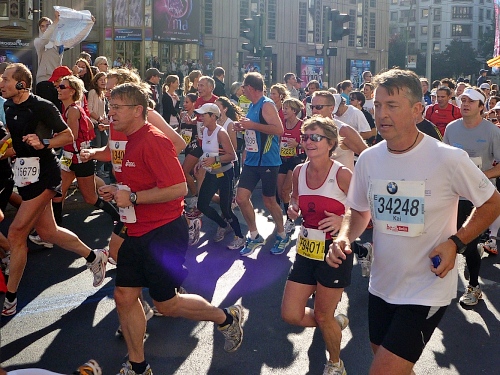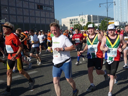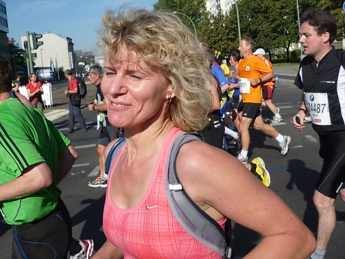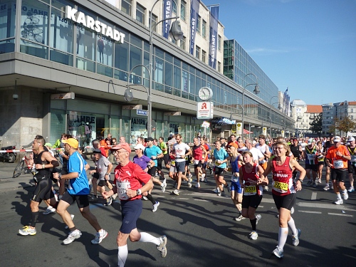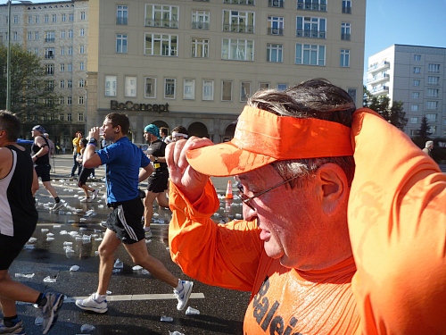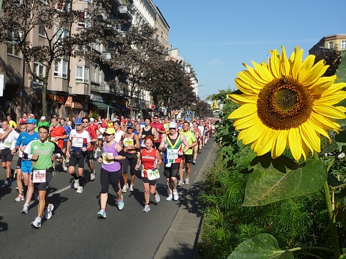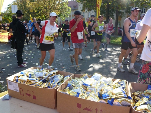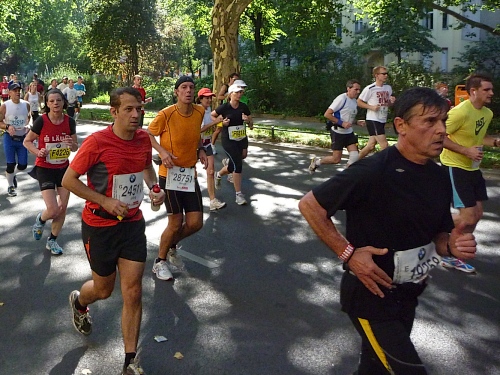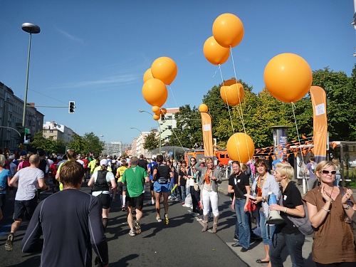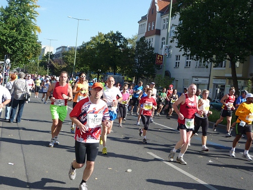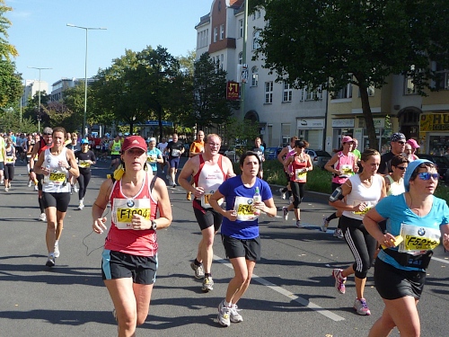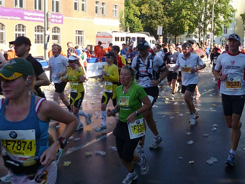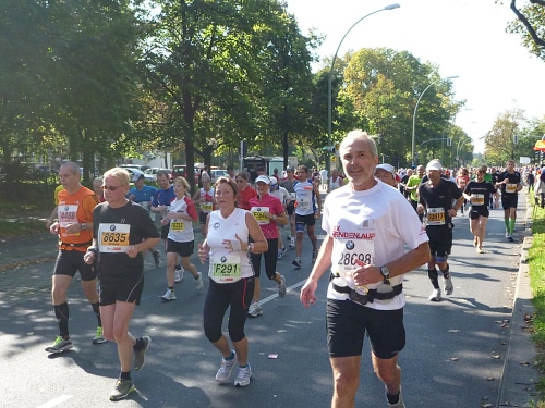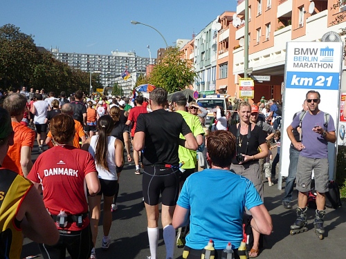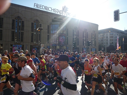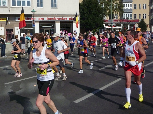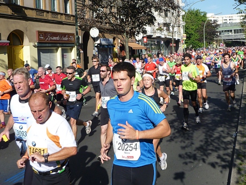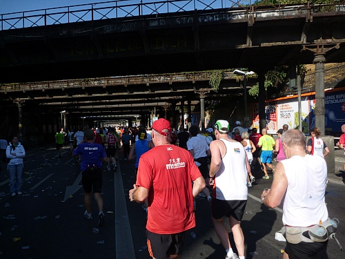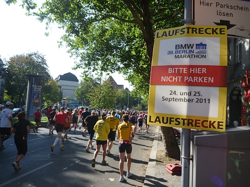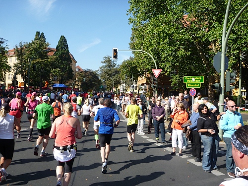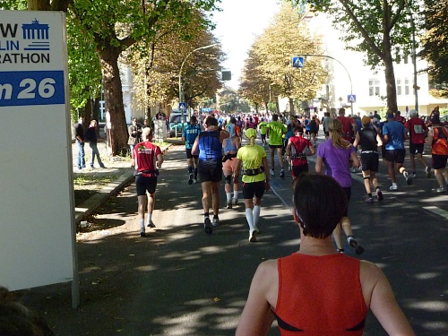Ein Läufer, der beim Berlin Marathon abgekürzt hatte behauptete, er hätte aus gesundheitlichen Gründen bis km 35 barfuß laufen müssen, danach erst die Schuhe mit dem Chip wieder angezogen. Heute wird alle 5 km die Zeit per Matte genommen. Ich lauf das erste Mal in Berlin, ich nehme mir alle Zeit der Welt. Mich interessieren nicht die Sehenswürdigkeiten, mich interessieren die Menschen, die Gesichter, die Vielfalt.