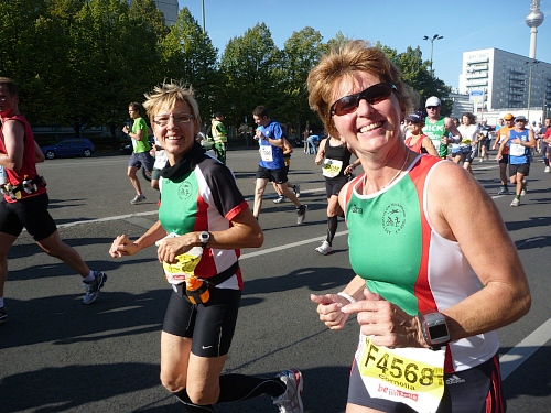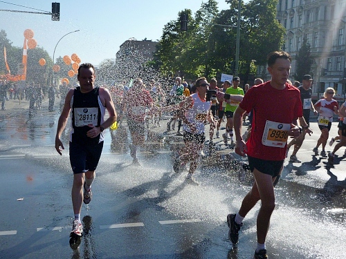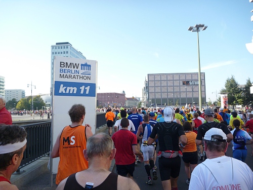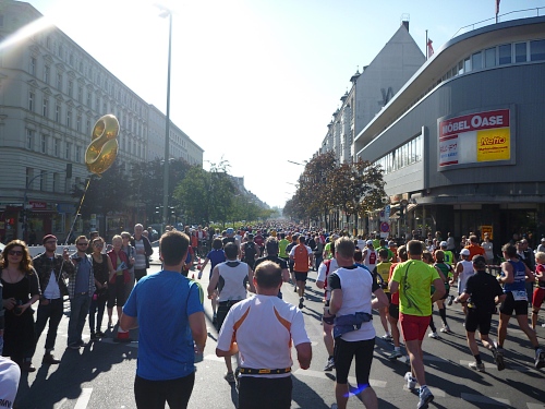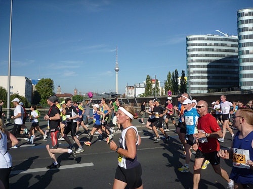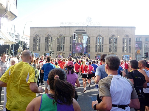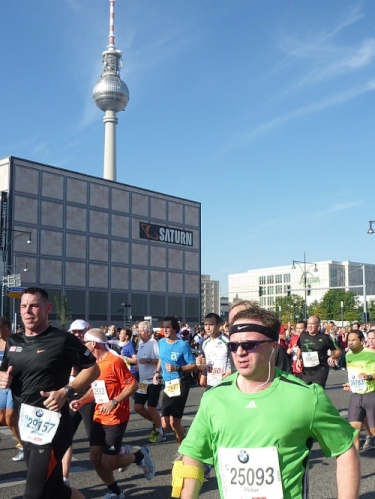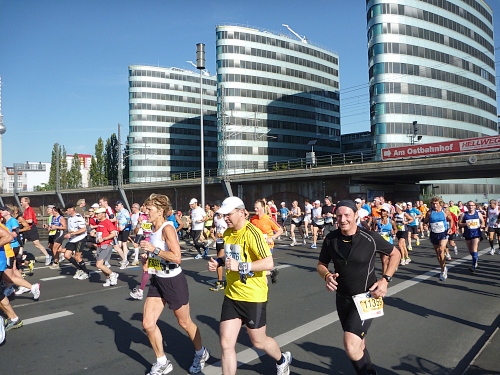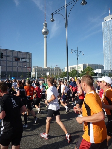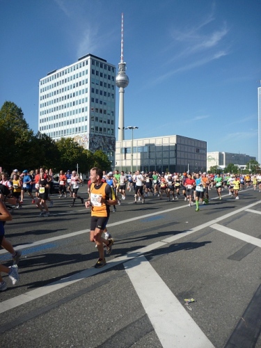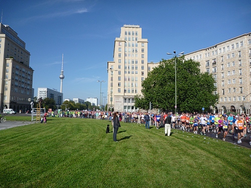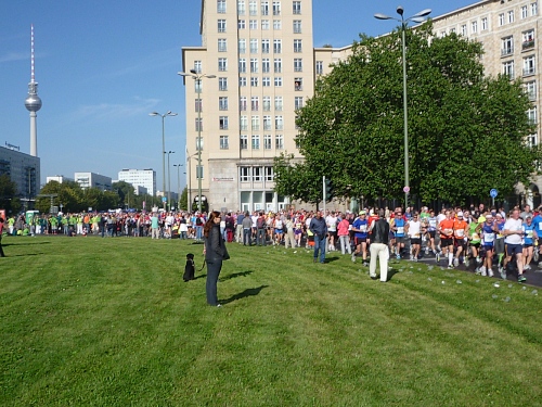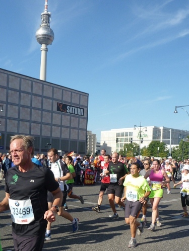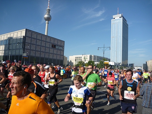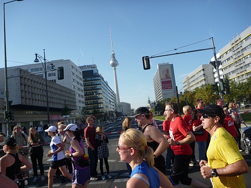 Otto Braun Srasse, km 11 Alexanderplatz. 1988 und 1989 musste der Fernsehturm am Alexanderplatz wegen Überfüllung geschlossen werden, so viele Ost-Berliner wollten das Marathonspektakel auf der anderen Seite der Mauer verfolgen. Einige DDR-Läufer waren schon zwischen den West-Läufern, sie durften für Verwandtenbesuch ausreisen und starteten unter falschen Namen. Ein Läufer aus Thüringen meldete sich nacheinander unter dem Namen seiner Katze, seines Hundes und seines Heimatdorfes an.