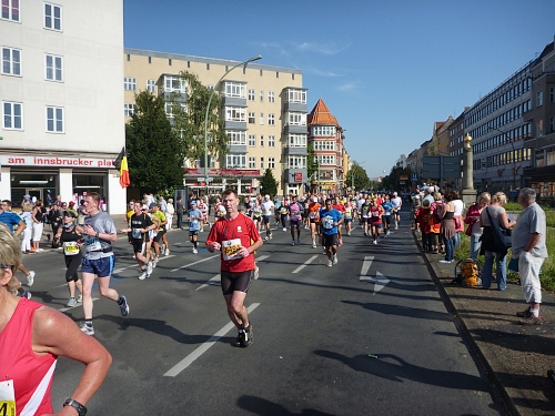 Martin Luther Straße, Rathaus Schöneberg. Der „Kennedy-Grill“ offeriert Kroatische Küche, 23 Stunden lang. Ich muss den Akku der Kamera wechseln. Zuviele Bilder. Immer noch Zuschauer, die nicht verstehen, dass man Fotos während eines Marathons schiessen muss.