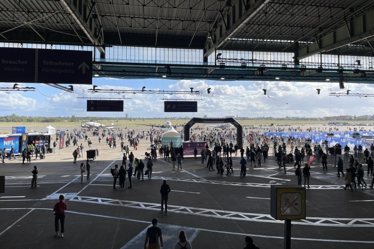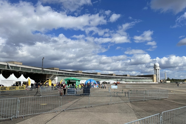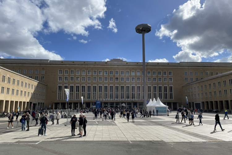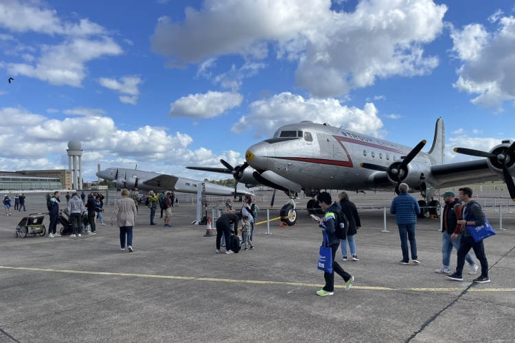 Das Luftbrückendenkmal im Park vor dem Empfangsgebäude erinnert uns daran, wird aber kaum wahrgenommen. Schon eher beeindruckt sind die Besucher der Messe von der historischen Empfangshalle und dem Ausmaß des Baukomplexes mit seinen Hangars, welches sich erst vom Flugfeld aus dem Betrachter erschließt. Dort auf dem Flugfeld sind auch einige historische Flugzeuge ausgestellt. Darunter die Douglas C54 "Skymaster", im Volksmund „Rosinenbomber“ genannt, weil sie während der Blockade nicht nur Güter nach Berlin brachte, sondern auch Süßigkeiten für die Kinder abwarf.