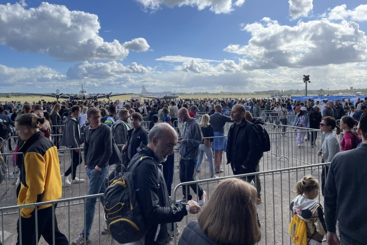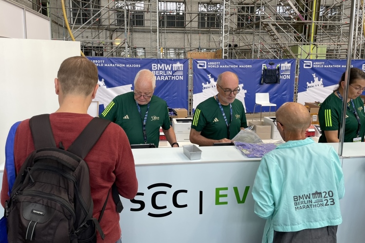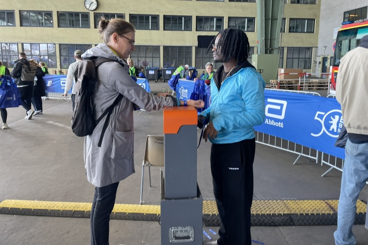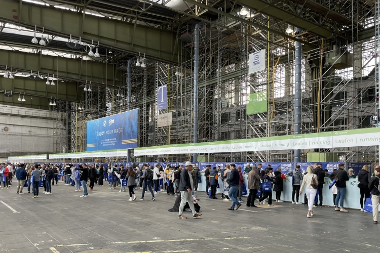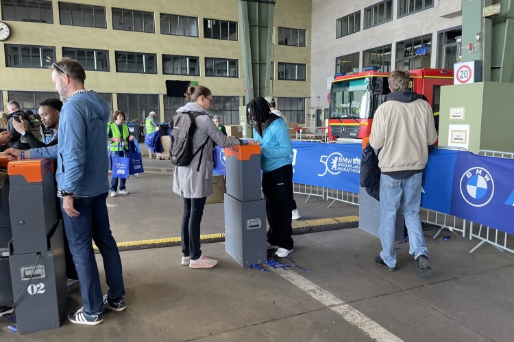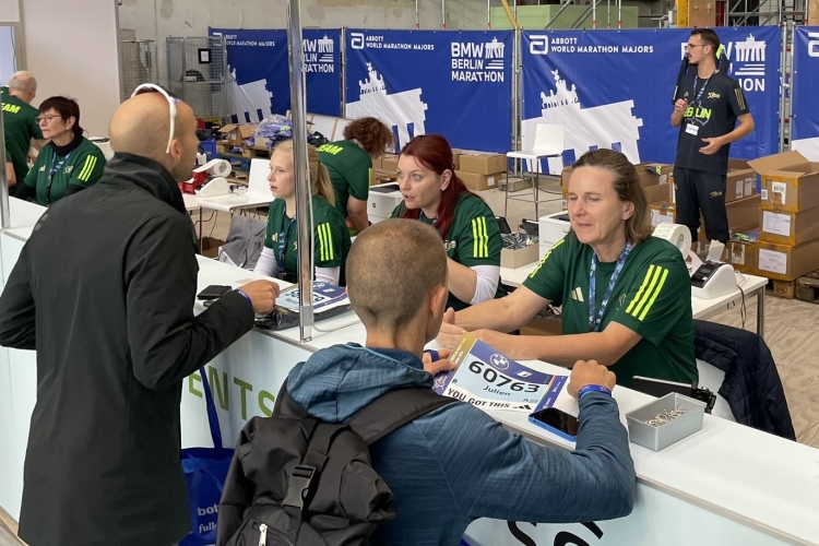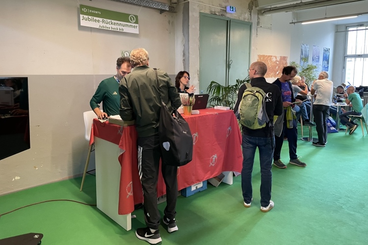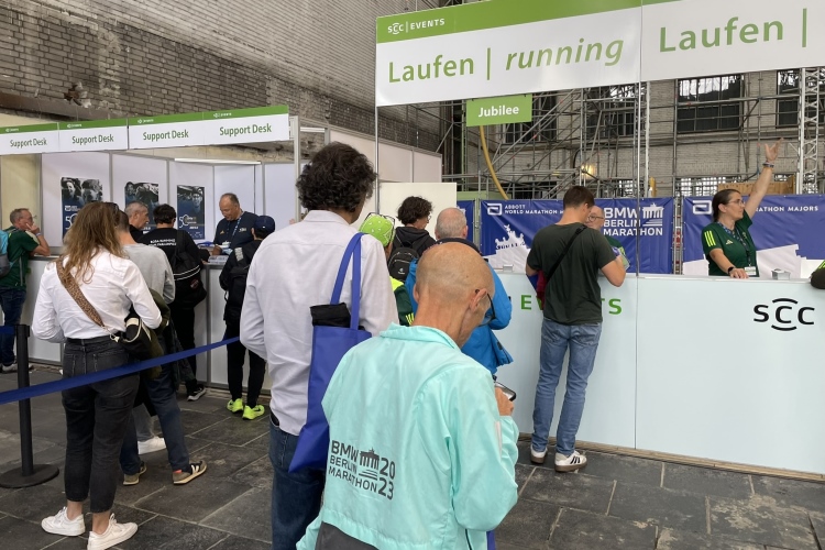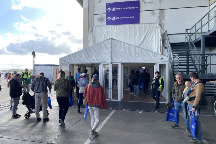 Zurück in der Gegenwart müssen wir zunächst die Anmeldeformalitäten erledigen, erste Hürde ist die Kontrolle des Startpasses und des Ausweises. Die lange Schlange der Teilnehmer wird durch Absperrgitter im Zickzack geführt, gefühlt kommen hier schon die ersten Kilometer zusammen. Danach bekommen wir ein Armbändchen, mit dem wir uns morgen ausweisen müssen, um in den Startbereich zu gelangen. Drittens dann nochmals eine Ausweiskontrolle bei der Ausgabe der Startnummern. Ein kompletter Hangar mit Dutzenden von Ausgabestellen ist hierfür vorgesehen, so dass sich trotz der vielen Teilnehmer keine langen Schlangen bilden. Für uns Jubilees ist ein extra Schalter vorgesehen, dort bekommen wir eine besondere, grün unterlegte Startnummer, die uns als mindestens 10-fachen Starter ausweist.