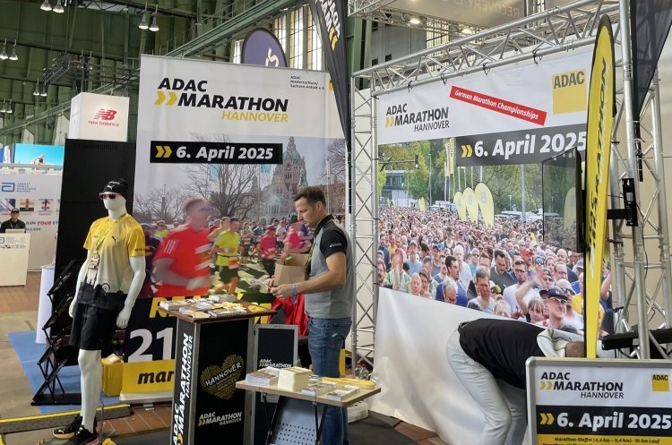 Nachdem die Formalitäten erledigt sind, öffnen sich die Türen für weitere Hangars mit einer Sportartikelmesse. Besonders beliebt sind die käuflich zu erwerbenden Finisher-Shirts, viele davon schmücken ihre Besitzer schon während des Laufes, in der Hoffnung, dass das auf dem Shirt Geschriebene auch eintritt. Neben Sportartikelanbieter sind auch Veranstalter anderer Marathons präsent, ich interessiere mich für den Hannover-Halbmarathon im nächsten April. Wer will, kann sich für Erinnerungsfotos vor besonderen Hintergrundleinwänden in langen Schlangen anstellen oder sich massieren lassen.