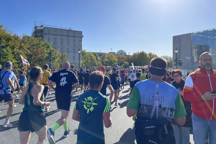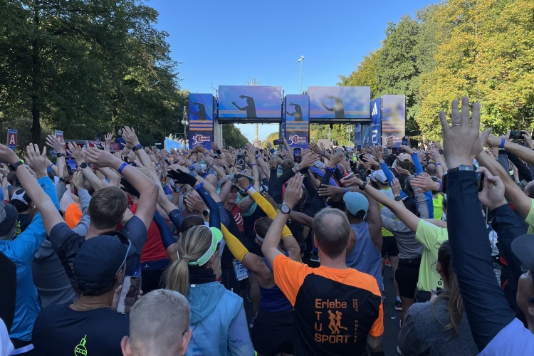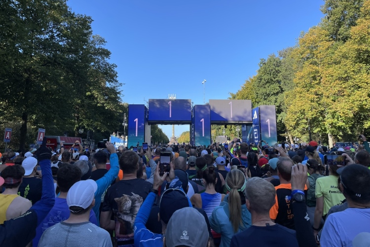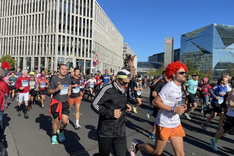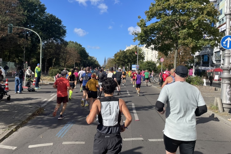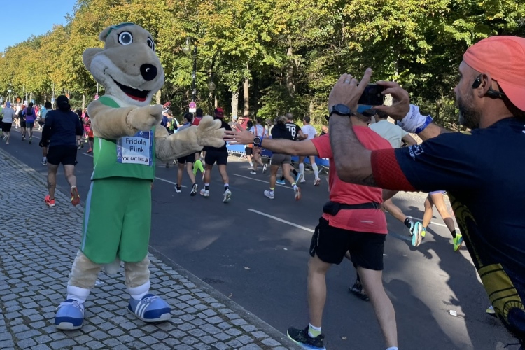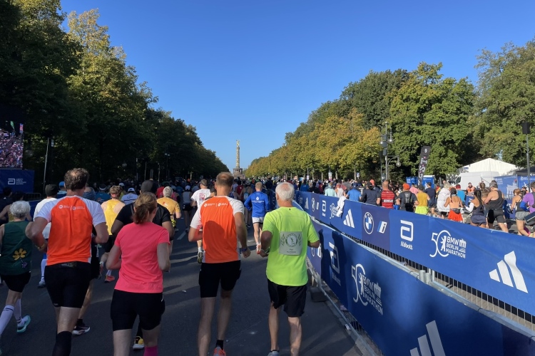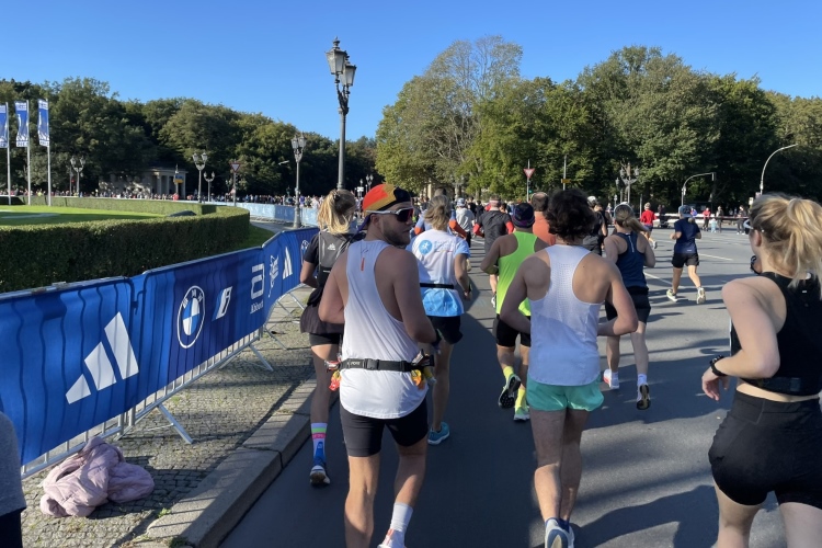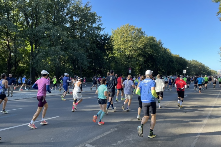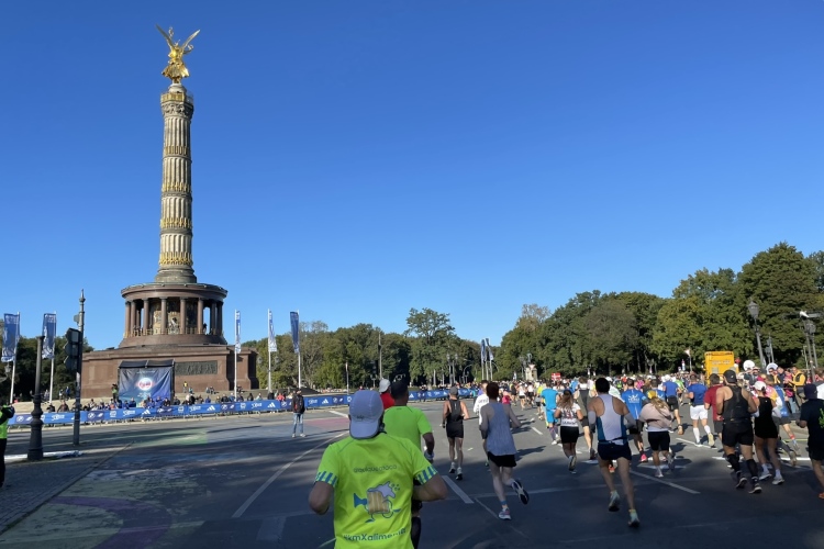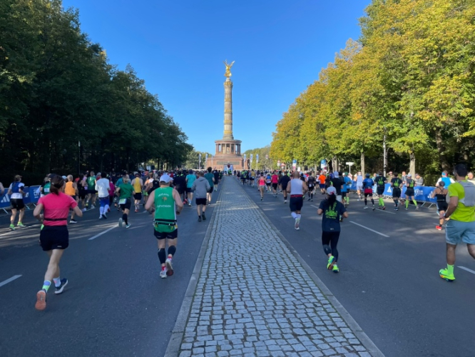 Auf den ersten Kilometern durch den Berliner Tiergarten, einem großen Landschaftspark mitten in der Stadt, kann sich das Feld auf der breiten Straße des 17. Juni, die an einen Volksaufstand 1953 in der damaligen DDR erinnert, entzerren. „Fridolin Flink“, das Maskottchen des Berlin-Marathons, steht in der Mitte der Straße und klatscht Läufer ab. Schon von weitem ist die in der Mitte des Tiergartens gelegene Siegessäule, wegen der vergoldeten Viktoria-Figur auch „Goldelse“ genannt, zu sehen. Dieses an drei Kriege im 19. Jahrhundert erinnernde (und mit vergoldeten Kanonenrohren „verzierte“) Denkmal umströmen die Läufer rechts und links auf dem „großen Stern“, einem riesigen Kreisverkehr.