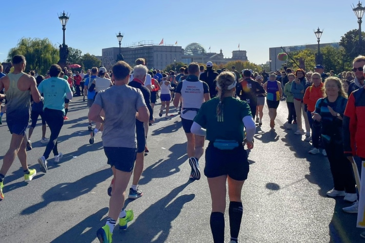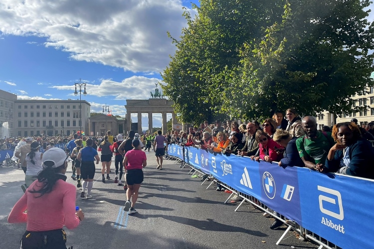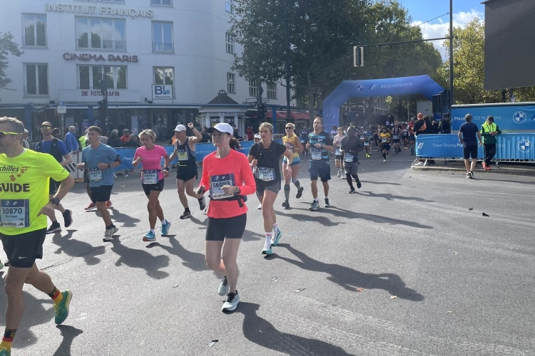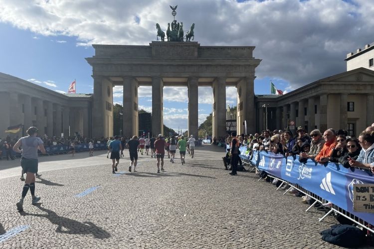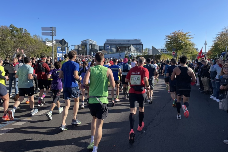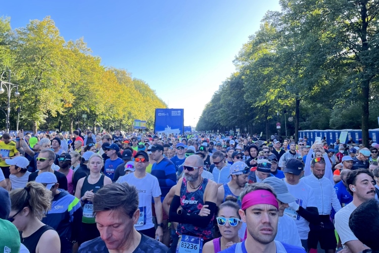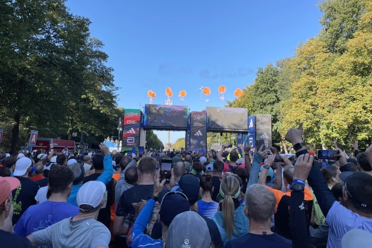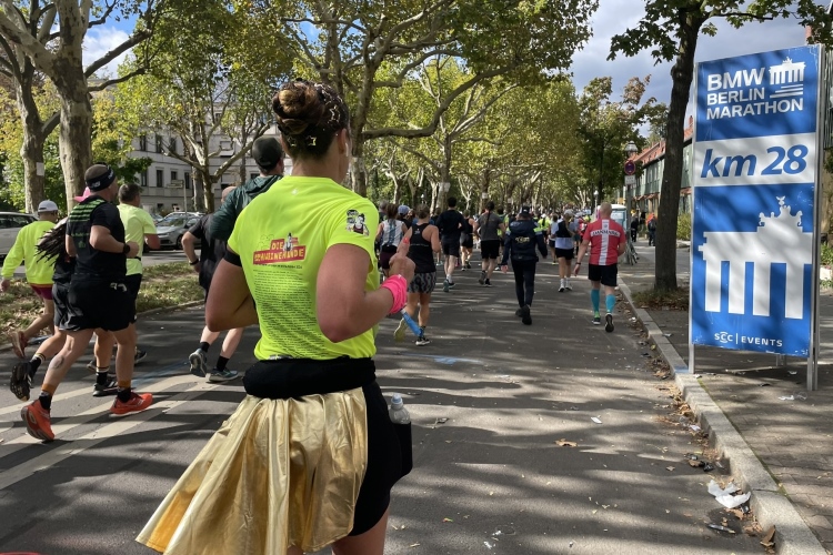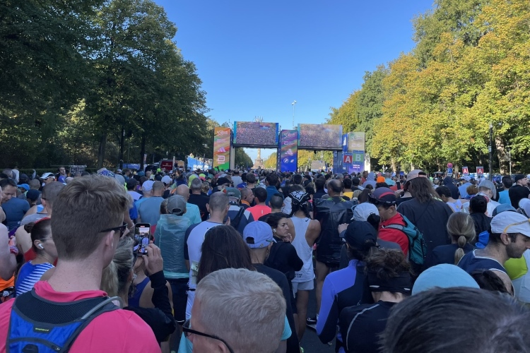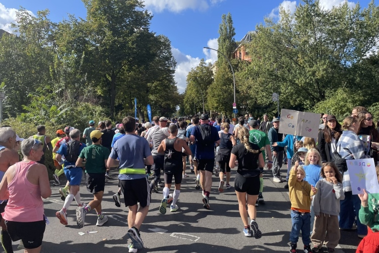 Auf den ersten Kilometern durch den Berliner Tiergarten, einem großen Landschaftspark mitten in der Stadt, kann sich das Feld auf der breiten Straße des 17. Juni, die an einen Volksaufstand 1953 in der damaligen DDR erinnert, entzerren. „Fridolin Flink“, das Maskottchen des Berlin-Marathons, steht in der Mitte der Straße und klatscht Läufer ab. Schon von weitem ist die in der Mitte des Tiergartens gelegene Siegessäule, wegen der vergoldeten Viktoria-Figur auch „Goldelse“ genannt, zu sehen. Dieses an drei Kriege im 19. Jahrhundert erinnernde (und mit vergoldeten Kanonenrohren „verzierte“) Denkmal umströmen die Läufer rechts und links auf dem „großen Stern“, einem riesigen Kreisverkehr.