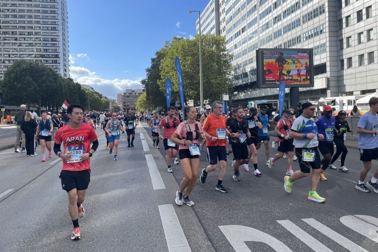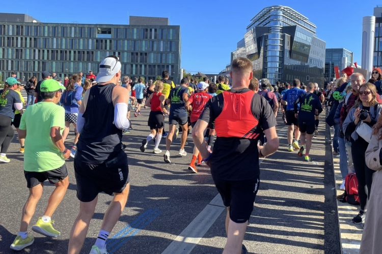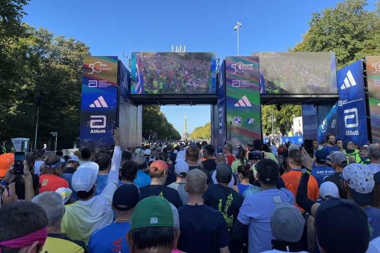 Im Startblock treffe ich auf M4You-Reporter Markus, der einen weiteren Laufbericht beisteuern wird. Auf großen Leinwänden sehen wir einige hundert Meter von der Startlinie entfernt, wie der Start des ersten Blocks erfolgt. Wir im zweiten Block haben noch 35 Minuten Zeit, der vierte und letzte Startblock geht sogar erst 1:25 Stunden nach den Profis auf die Strecke – solange braucht es, um ungefähr 58000 Starter auf den Weg zu bringen und das Teilnehmerfeld etwas zu auseinanderzuziehen, was auch dringend notwendig ist.