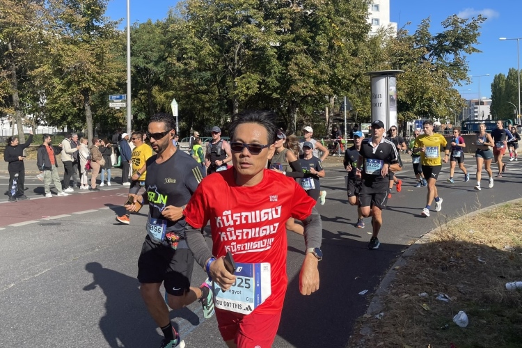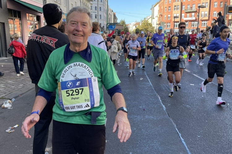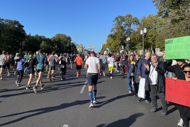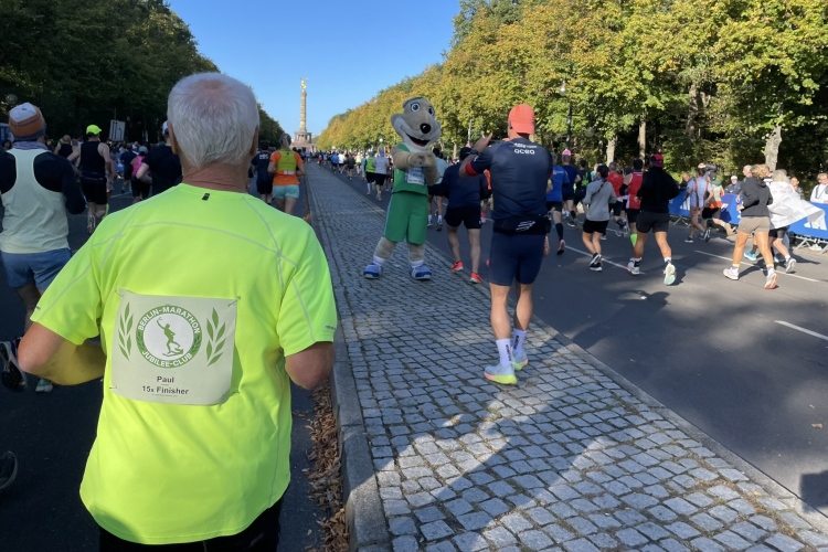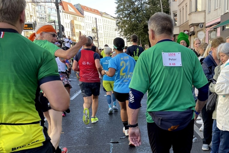 Vor mir läuft Peter. Er, Altersklasse 80, nahm am allerersten Berlin-Marathon 1974 teil. Seit Jahren unterstützt er die letzten Läufer des Marathons und ermuntert sie, nicht in den Besenwagen einzusteigen, sondern zu finishen. Heute nimmt er anlässlich des Jubiläums als einer von vier Läufern der ersten Stunde noch einmal selbst teil, ein wenig mit Wehmut, wie er mir sagt, denn er erinnert sich an seine Marathons unter 3 Stunden. Am Ende wird er der letzte Finisher von 54.280 sein und gebührend gefeiert werden. Respekt, Peter.
