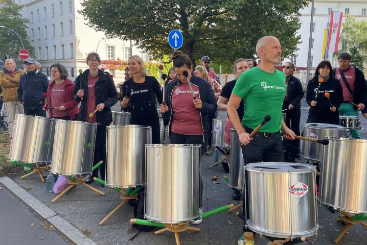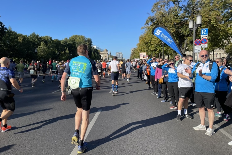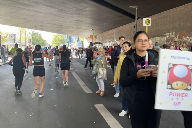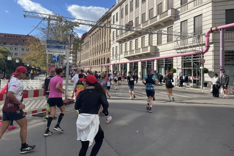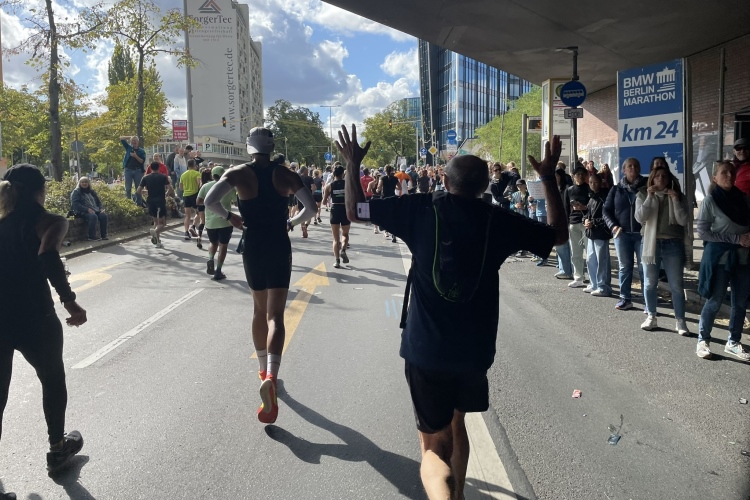 Kilometer 24, Innsbrucker Platz. Gleich zwei Highlights erwarten mich, nachdem mich mein Sohn hier angefeuert hat. Die Drumband unter der Bahnbrücke. Hier fliegen Dir die Ohren weg und Du möchtest im Takt der Trommeln hüpfen. Für mich der musikalische Höhepunkt. Nur 100 Meter weiter der „Marathon-Balkon“, fetzige Musik und Anfeuerung von oben. Die Marathon-Party dort hat Tradition.