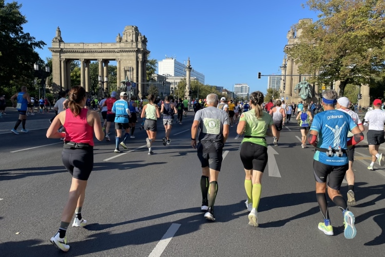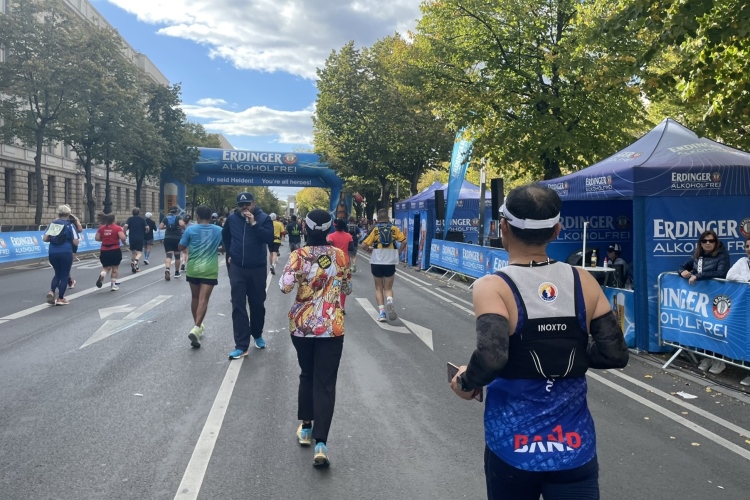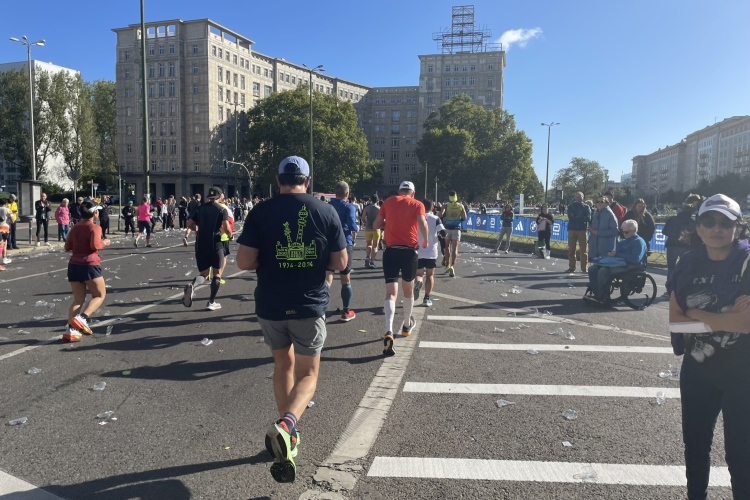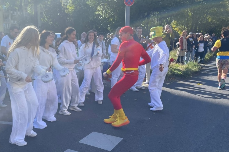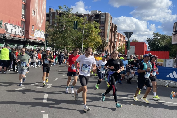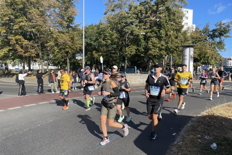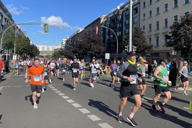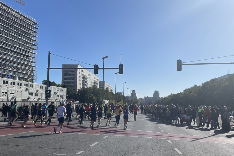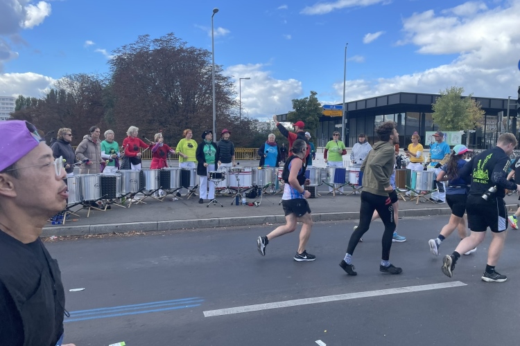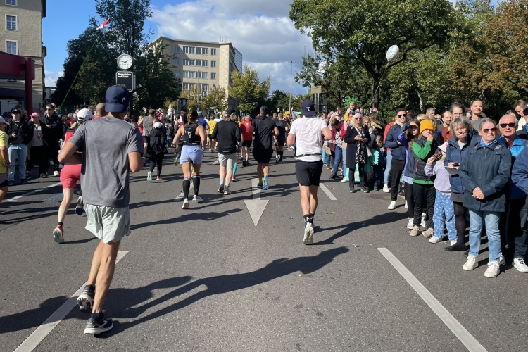 Wir kommen zum Alexanderplatz und über die breite Frankfurter Allee zum Straußberger Platz, dort erwartet uns die nächste Getränkeversorgung bei km 12. Auf der Dreiviertelrunde um diesen großen Kreisverkehr ist sehr schön die endlose Reihe der Läufer zu erkennen. Wenig später ertönt Samba-Musik an der Strecke. Ein Läufer in einem Superheldenkostüm unterbricht seinen Lauf und tanzt eine Weile mit. Dutzende von Bands, Drummer, Blasorchester, Kombos liefern heute eine Geräuschkulisse, die ihresgleichen sucht. Außerdem sind noch viele Zuschauer mit ihrer Musikanlage an die Strecke gekommen.