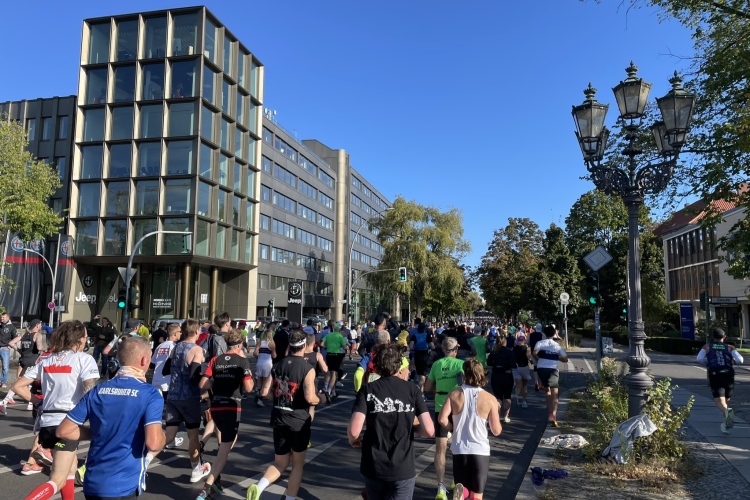 Danach wird es in der Rheinbabenallee, die schmaler ist, ein wenig eng sogar. Eine schöne Allee, alte Gaslaternen, eine gediegene Wohngegend. Aber aufpassen: Mein Chef ist bei km 29 an der Strecke, um zu schauen, ob ich auch alles gebe… Spaß muss sein. Danach biegen wir auf den Hohenzollerndamm ein. Hier ist wieder Platz, dennoch fällt dieser Abschnitt vielen schwer, denn die Strecke zieht sich in einer endlos scheinenden Geraden hin. Wir sind bei km 30, der Mann mit dem Hammer schlägt zu. Bei mir noch nicht, ich erreiche am Fehrbelliner Platz in Wilmersdorf den nächsten Hotspot, auch hier eine Drumband und sehr viele Zuschauer, die wissen, dass wir jetzt Unterstützung brauchen.