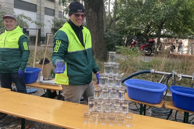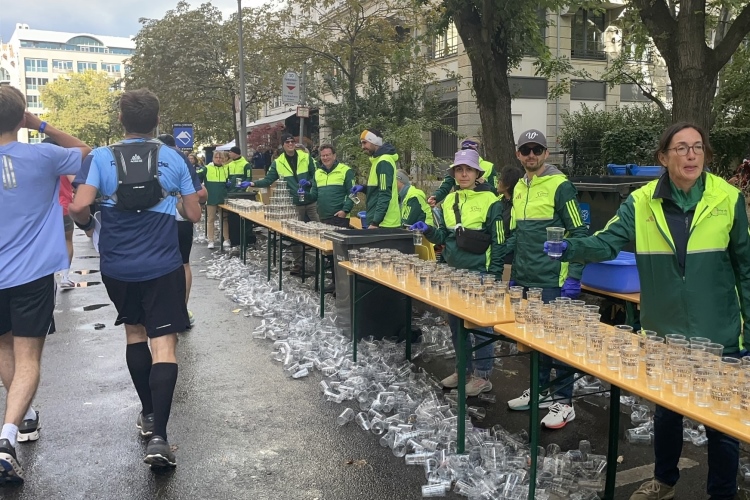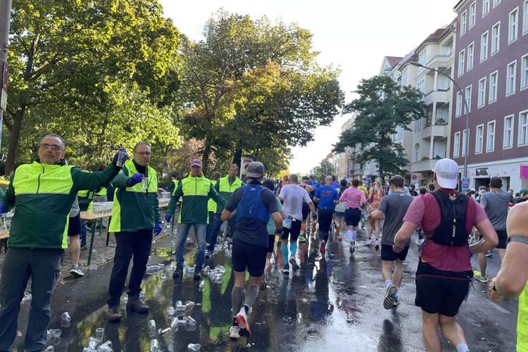 Auf der Potsdamer Straße ist es etwas ruhiger. Es gilt auf müden Beinen auf die in der Straße eingelassenen Straßenbahnschienen zu achten, Stolpergefahr. Schon bald folgt die letzte Getränkestelle, hier wurden Wasserbecher zu einer Pyramide aufgetürmt. Das war sicher vor dem Lauf, denn bei dem Ansturm der Massen dürfte danach hierzu wenig Zeit gewesen sein. Ich frage, ob ich den Becher aus der Mitte der Pyramide haben darf …