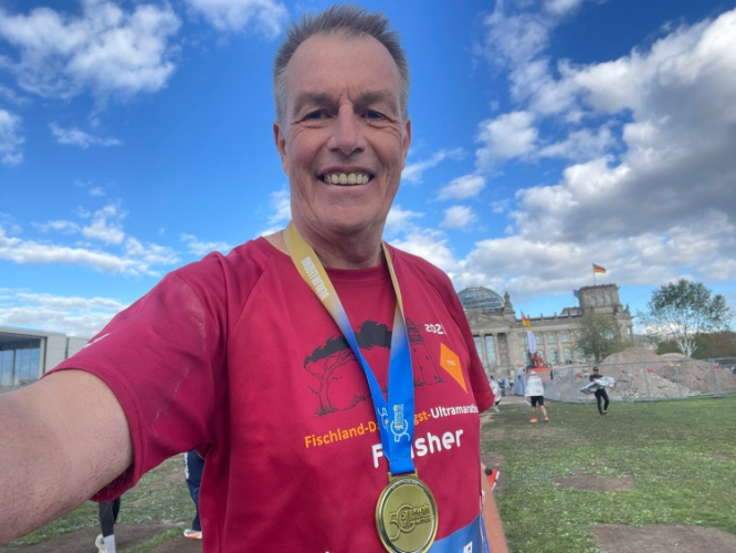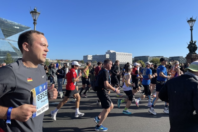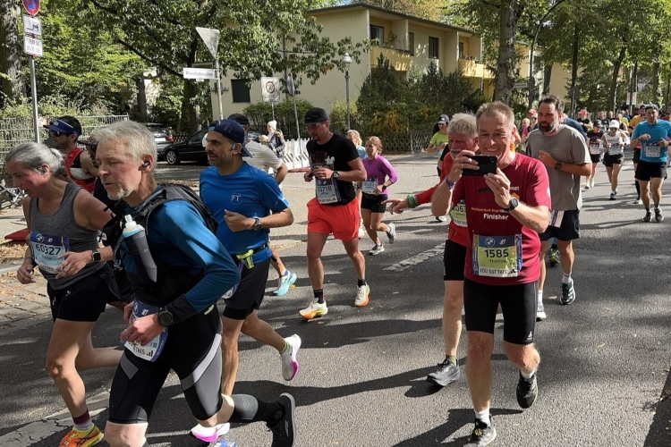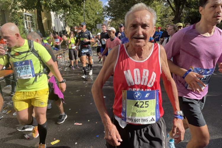 An der Verpflegungsstelle bei km 20 laufe ich auf Günter auf. Er ist 82 und heute das 43 mal dabei. Wir kennen uns schon seit Jahren und daher weiß ich, was sonst keiner um uns herum zur Kenntnis nimmt. Günter Hallas ist der Sieger des allerersten Berlin-Marathons 1974. Natürlich finisht er heute auch, es dauert halt ein wenig länger als vor 50 Jahren.