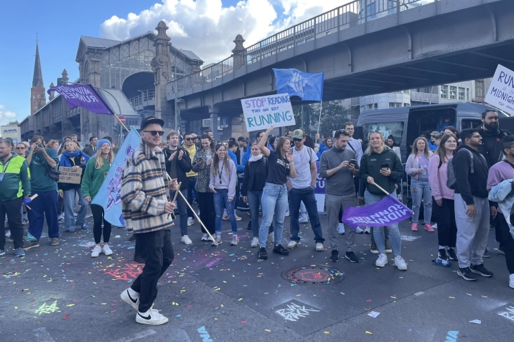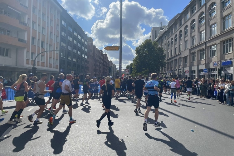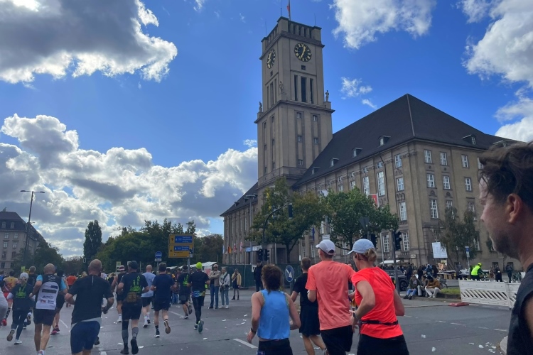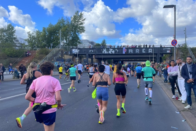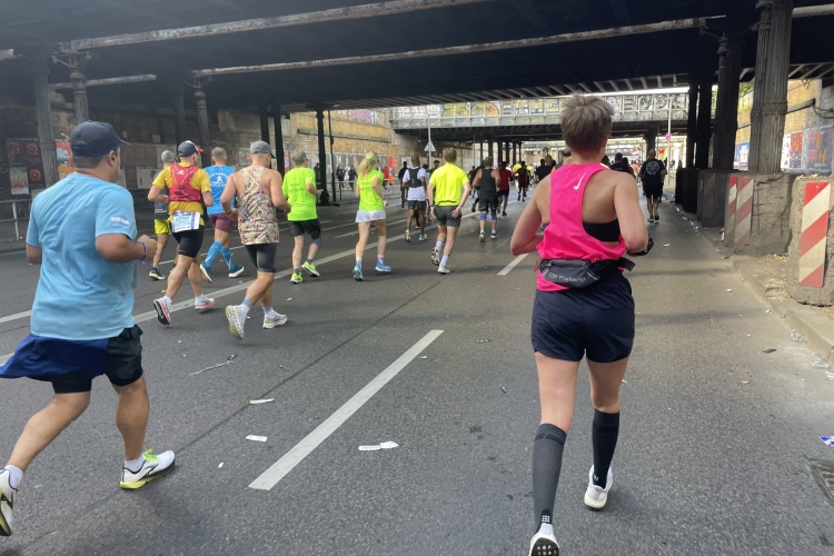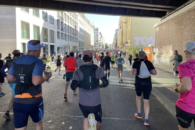 Schon von weitem sehen wir den Friedrichsstadtpalast, eines der größten europäischen Revuetheater. Heute stehen nicht die Beine der Tänzerinnen und Tänzer im Fokus, sondern auf die unsrigen kommt es an, denn es sind noch 34 km bis zum Ziel. In der Torstraße bei km 10 dann die erste Verpflegungsstation. Wir befinden uns im Scheunenviertel, dessen Name an die Scheunen erinnert, die ehemals außerhalb der Stadtmauer errichtet wurden. Heute mitten in der Stadt gelegen, erinnert nur wenig daran. Rechts und links begleiten uns schon eine Weile vier- bis fünfstöckige Wohnhäuser.