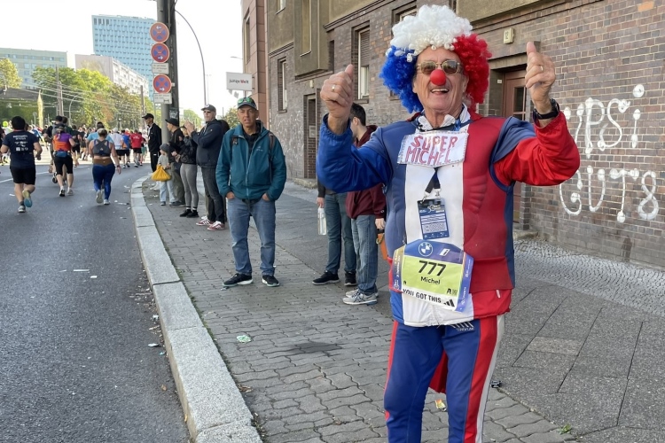 Dann ein weiteres Urgestein. Michel, der fröhliche Franzose. Lange Jahre habe ich ihn im blau-weiß-roten Clownkostüm als Teilnehmer erlebt, heute feuert er uns vom Streckenrand aus an.