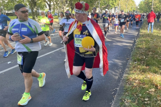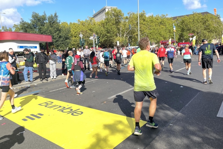 Der nächste kostümierte Läufer lässt nicht lange auf sich warten, König Frank mit Zepter, Krone und Reichsapfel gibt sich die Ehre. Kurz danach dann Bertrand als Wildkatze. Wir kommen nach Kreuzberg. Hier verlief früher die Berliner Mauer, am Boden durch zwei Reihen von Pflastersteinen erkennbar, von denen allerdings kaum jemand Notiz nimmt. Am Moritzplatz vorbei erreichen wie die nächste Verpflegung bei km 15. Hier ist die Versorgung beidseitig der Straße angelegt, somit kommt kein Gedränge auf.