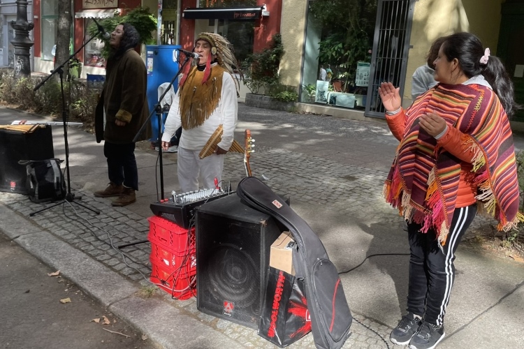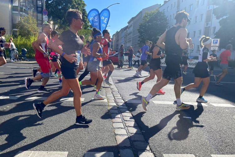 Am Hermannsplatz biegen wir rechts ab und laufen nach der nächsten Getränkestation bei km 18 auf den Südstern mit der eindrucksvollen Kirche in Insellage zu. Die jetzt folgenden Kilometer sind einer meiner Lieblingsabschnitte. Eine schöne, schattige Mittelallee, viele Zuschauer und Musikgruppen. Zum Beispiel eine kleine indigene Gruppe, die Musik aus den Anden darbietet, sie steht immer an der gleichen Stelle. Ich freue mich immer auf den Klang der Panflöten.