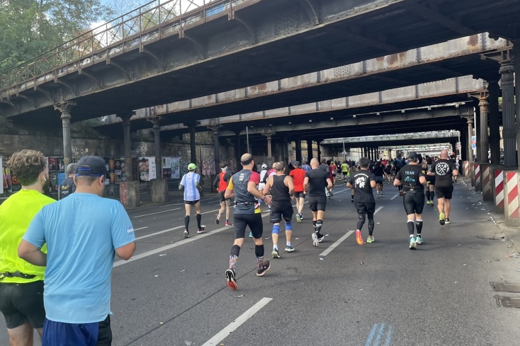 Mit großem Respekt vor Peter, Michel, Volker und Günter laufe ich weiter. Als nächstes folgen die Yorckbrücken, eine Reihe von Eisenbahnbrücken, deren Gleise über die Yorckstraße zu den ehemaligen Bahnhöfen Potsdamer und Anhalter Bahnhof führten. Ein eindrucksvolles technische Denkmal und Hot-Spot, Zuschauer unter und auf den Brücken. Dann ist der Halbmarathon geschafft.