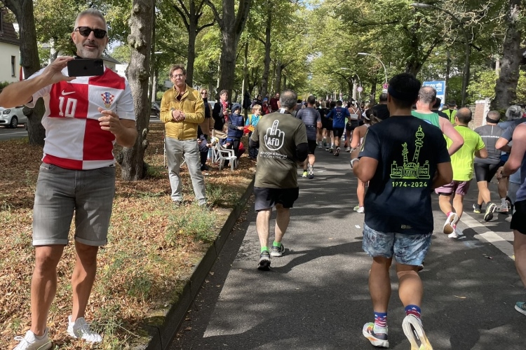 Bald darauf erreichen wir nach Stärkung an einer weiteren Verpflegungsstelle den Friedrich-Wilhelm-Platz. Wir laufen direkt auf eine mit roten Ziegeln verblendete, imposante Kirche zu. Nun sind wir in Friedenau angekommen, die Anwohner machen hier richtig Party. Dies braucht es langsam auch, 26 Kilometer stehen auf der Uhr. Eine Gruppe von Dudelsackspielern in schottischen Kostümen feuert uns an. Dann geht es weiter Richtung „Wilder Eber“, benannt nach dem gleichnamigen Platz, km 28. Hier ist ein Stimmungskulminationspunkt, Band, Cheerleader, viele Anwohner, die ihr Bestes geben, um uns anzutreiben.