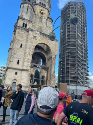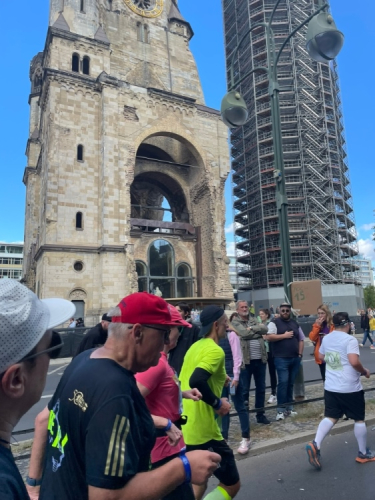 Über die Konstanzer Straße erreichen wir den Kurfürstendamm in Charlottenburg. Die preußische Blaskappelle am Straßenrand macht auch gerade Pause, so ein Pech. Dann weiter an der Gedächtniskirche, von der seit dem Krieg nur noch eine Turmruine ergänzt durch Neubauten steht, vorbei zum Wittenbergplatz, km 35. Jetzt sagt der Mann mit dem Hammer auch „Hallo“ zu mir und ich muss öfters gehen. Damit bin ich bei weitem nicht der Einzige. Auch hier am Wittenbergplatz ist richtig was los – wie auch kurz darauf am Nollendorfplatz. Den Vogel schießen aber die „Midnight Runner“ an der Bülowstraße ab, eine Laufcommunity, die uns förmlich ins Ziel schreit.