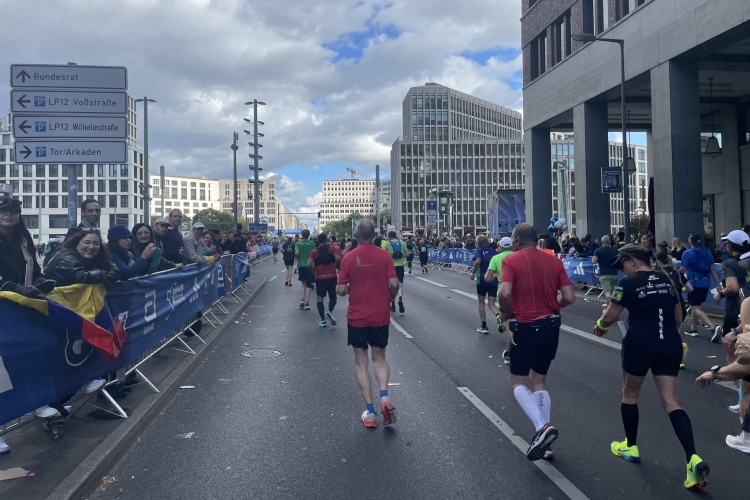 Wir streben dem Regierungsviertel zu, die Kuppel des Reichstagsgebäudes ist sichtbar, auch das Bundeskanzleramt und linker Hand grüßt der Hauptbahnhof. Hier stehen die Zuschauer in dichten Reihen. Sicher haben viele von ihnen eben noch den Läufer auf dem nahegelegenen Startgelände zugejubelt. Bei km 7 wieder eine der kleinen Spreeanstiege, zur Belohnung können wir anschließend Richtung Friedrichstadt rollen. Eine Läuferin erzählt auf einem Rückenplakat ihre überstandene Krankheitsgeschichte. Wir werden noch viele andere sehen, die auf Ihren Shirts eine Botschaft mitteilen, manche erinnern an einen lieben Verstorbenen.