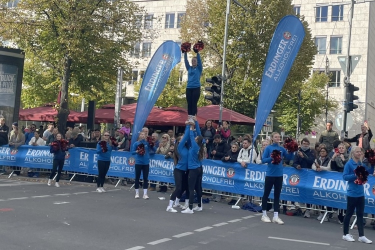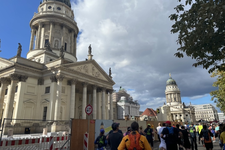 Dann folgt der Gendarmenmarkt mit Berliner und Französischen Dom und dem Konzerthaus. Ein einzigartiges Bauensemble, aber leider schon seit Jahren Baustelle. Vor mir läuft ein Barfuß-Läufer, nicht der einzige heute, die insgesamte glatte und saubere Straßenoberfläche lässt dies sicher ohne größere Verletzungen zu. Ich bleibe lieber in den Schuhen und gelange schon bald auf die Zielgerade, auf die Straße „Unter den Linden“. Auch hier gibt es eine Pyramide, aber nicht aus Wasserbechern, sondern aus einer Gruppe von Cheerleadern – wie lange die das wohl durchhalten?