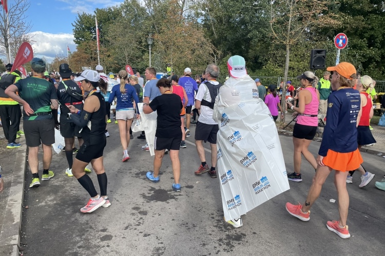 Nun heißt es noch, eine Wärmefolie aufzunehmen (heute hat es mit 15 Grad zwar optimales Laufwetter, aber im Ziel kühlen wir schnell aus) sowie einen Verpflegungsbeutel, meinen Startbeutel mit den Wechselsachen abzuholen und zu duschen (in erstklassigen Duschcontainern).