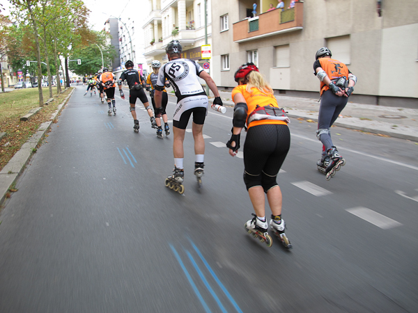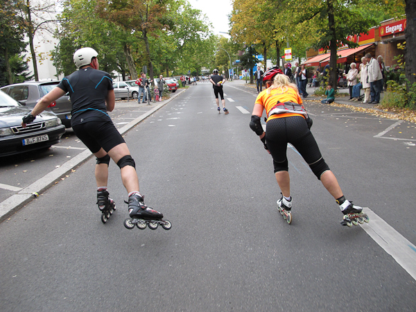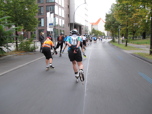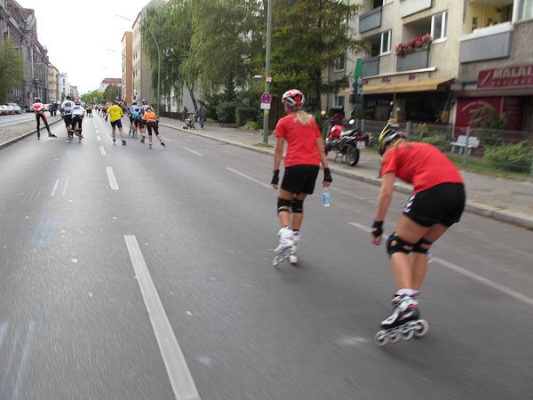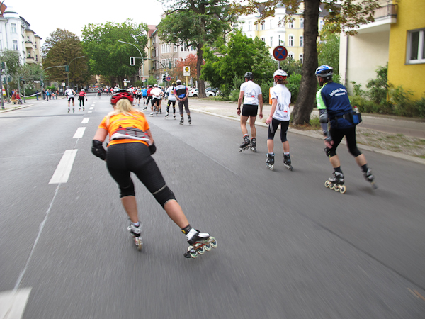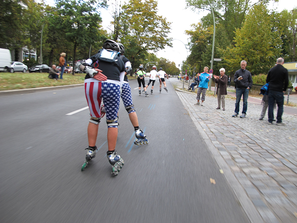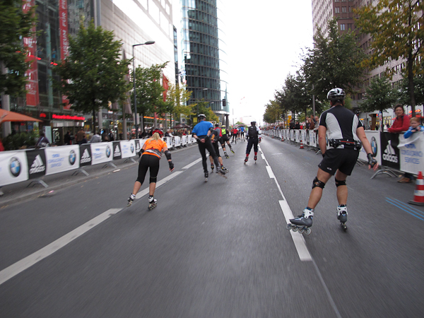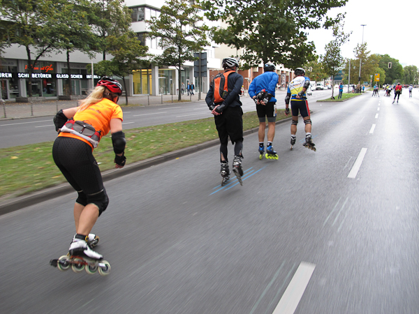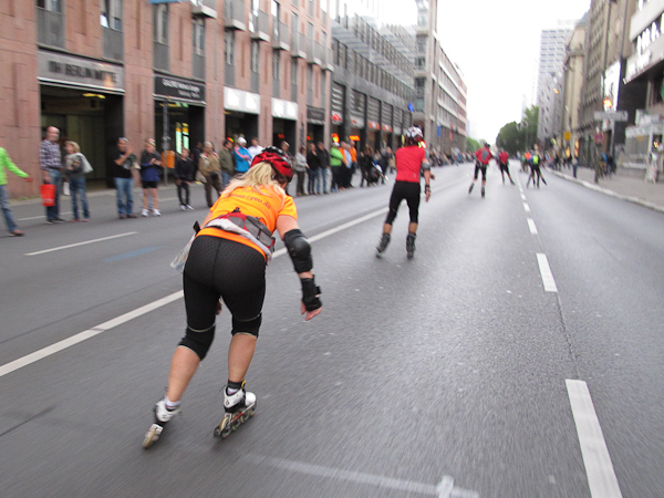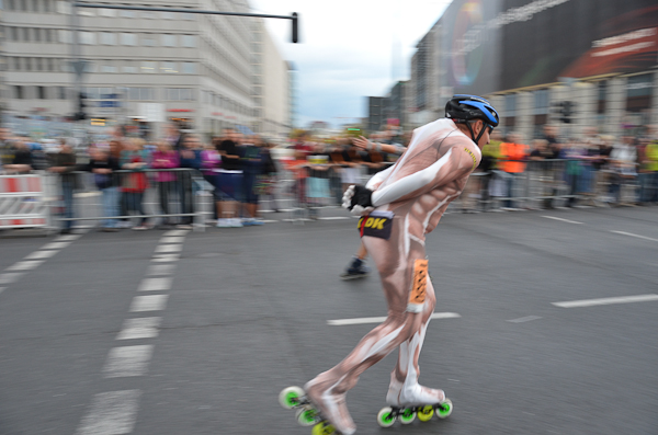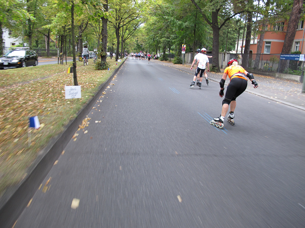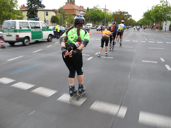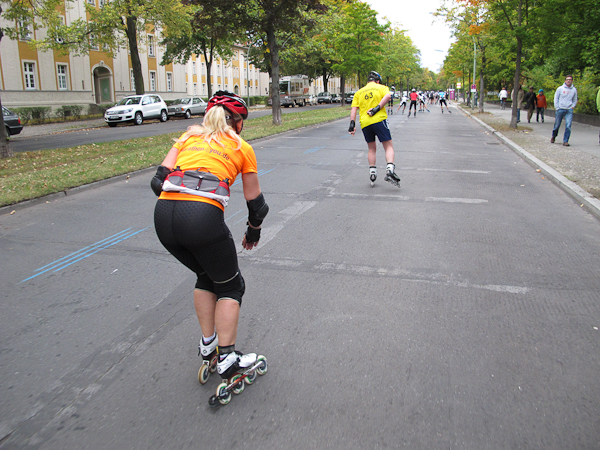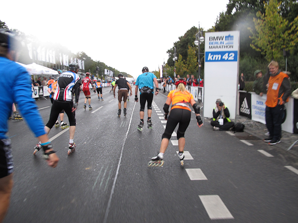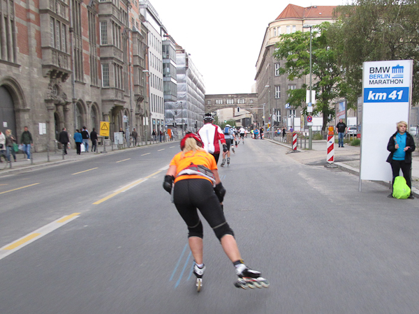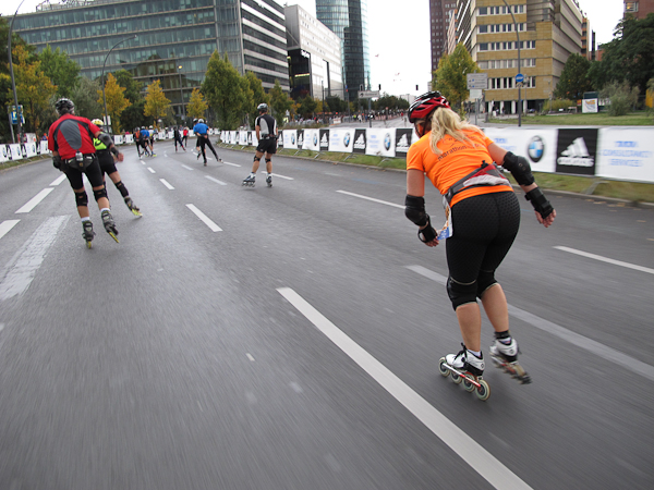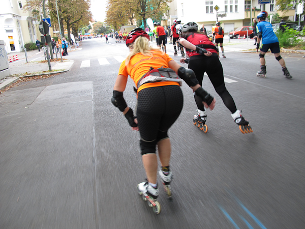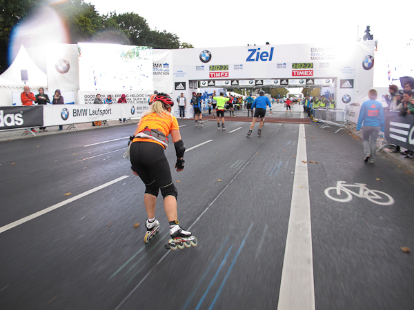 Bei dieser Dauerhöchstgeschwindigkeit überlege ich, wie schön es wäre, so schnell durch Berlin laufen zu können. Zsssss, Kilometer 21 und genügend Kraft, noch mehr Druck zu geben. Zssss, Kilometer 26, ein schneller Richtungswechsel, ich bin im Rollers-High und die Elite schon lange im Ziel. Der Rücken fängt an zu schmerzen und die Pobacken brennen, aber was tut man nicht alles für einen schönen Hintern, denke ich und versuche die Schmerzen zu ignorieren.
