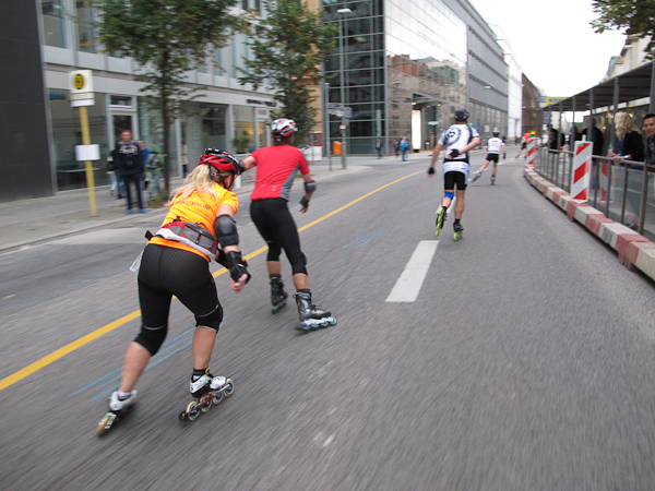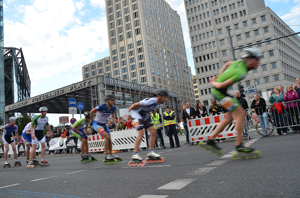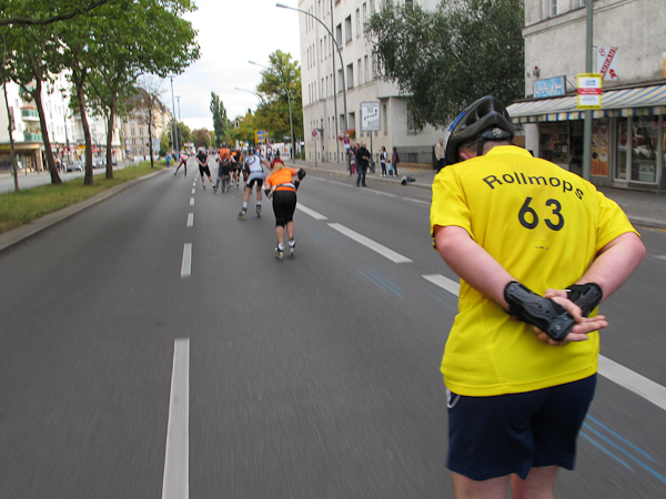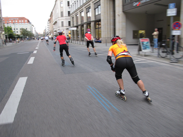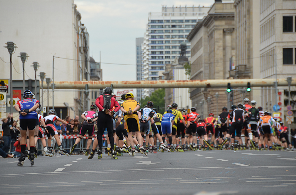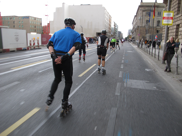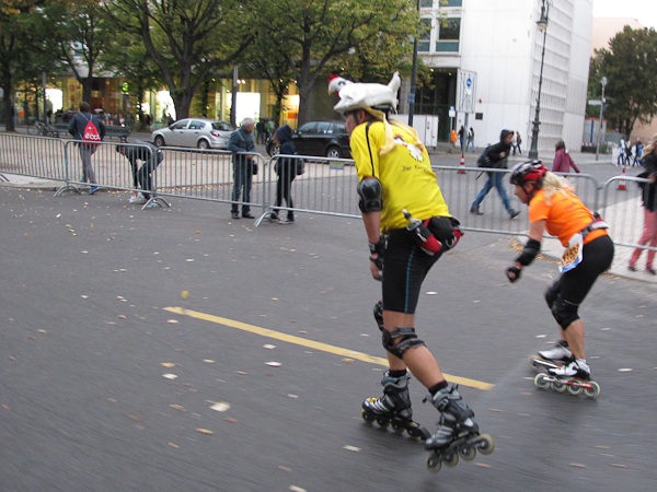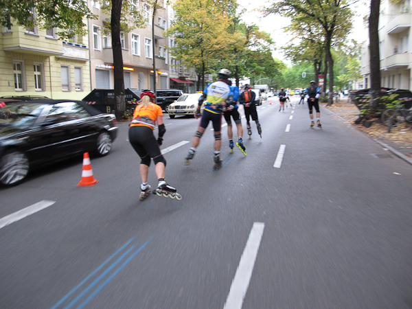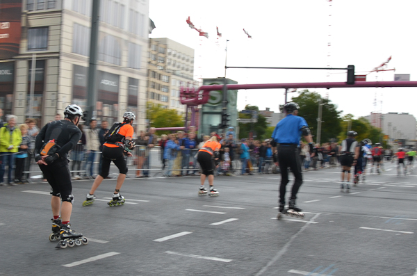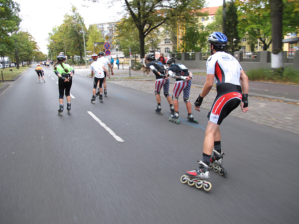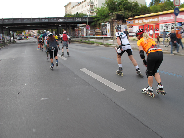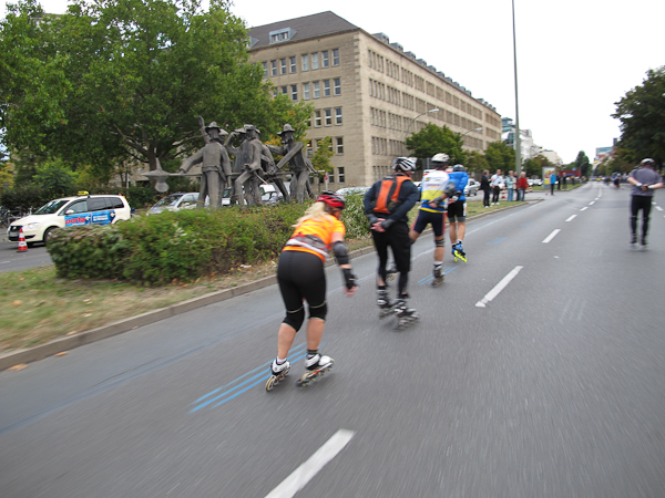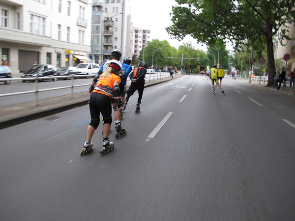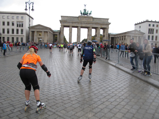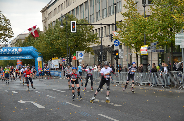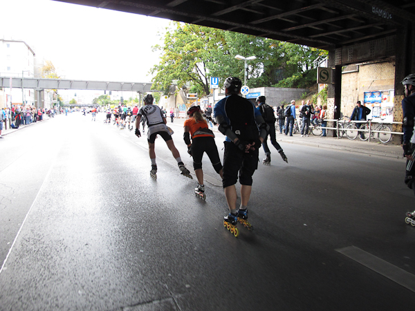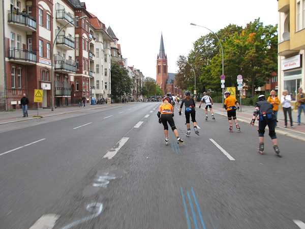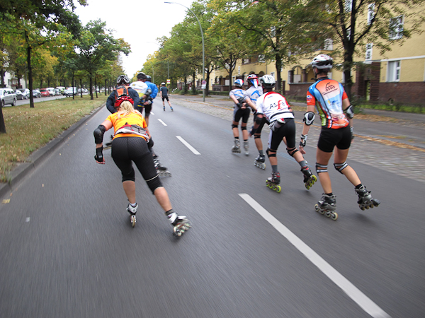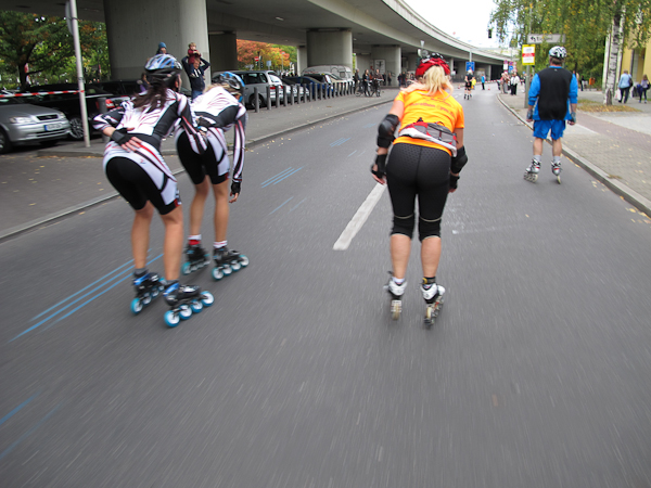 Bei dieser Dauerhöchstgeschwindigkeit überlege ich, wie schön es wäre, so schnell durch Berlin laufen zu können. Zsssss, Kilometer 21 und genügend Kraft, noch mehr Druck zu geben. Zssss, Kilometer 26, ein schneller Richtungswechsel, ich bin im Rollers-High und die Elite schon lange im Ziel. Der Rücken fängt an zu schmerzen und die Pobacken brennen, aber was tut man nicht alles für einen schönen Hintern, denke ich und versuche die Schmerzen zu ignorieren.