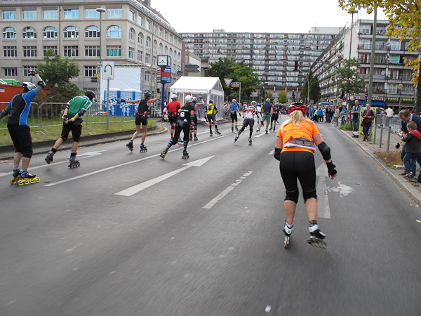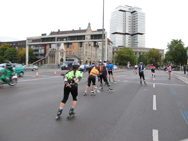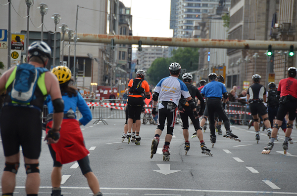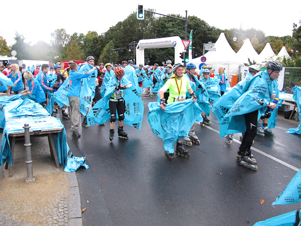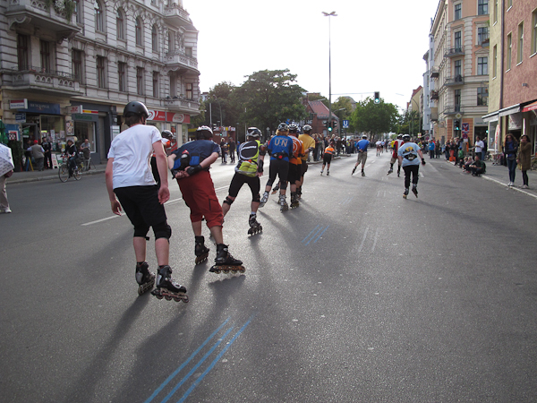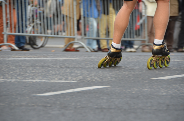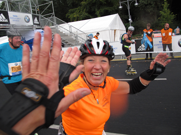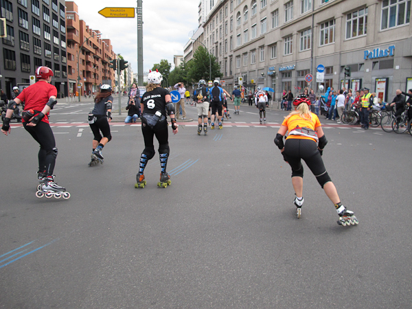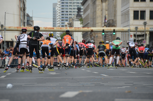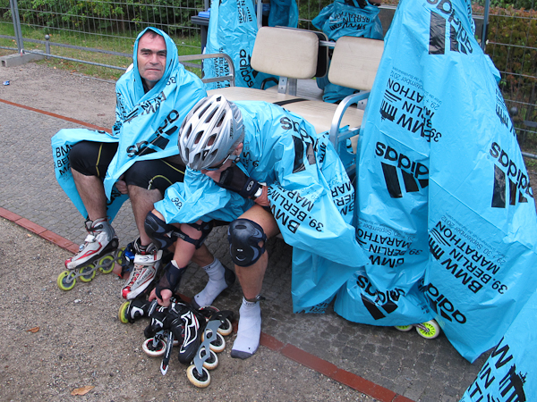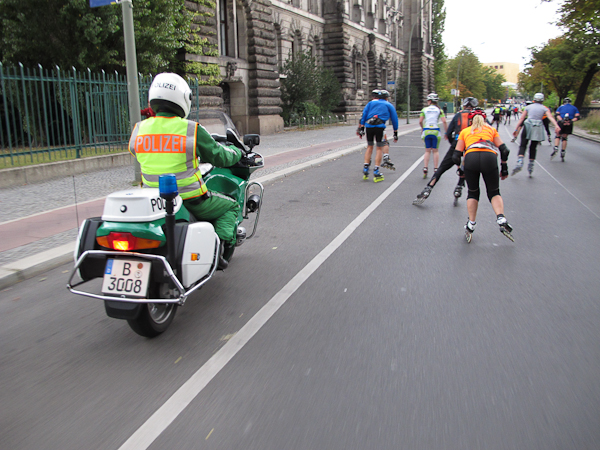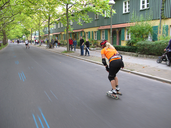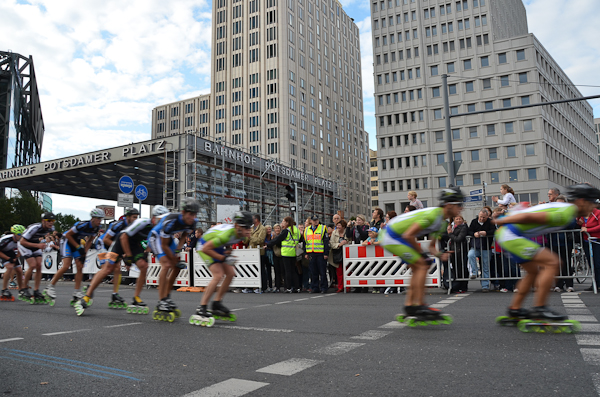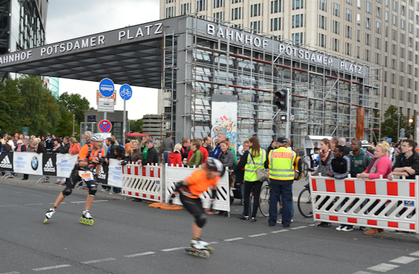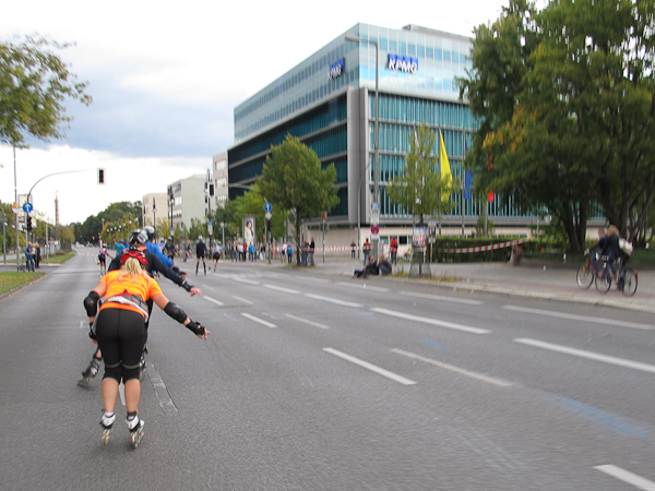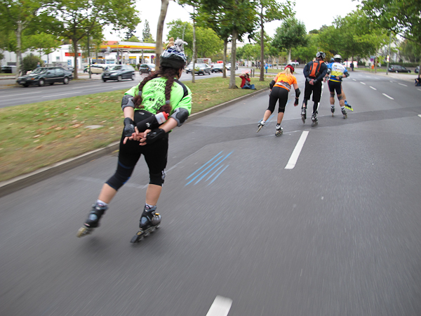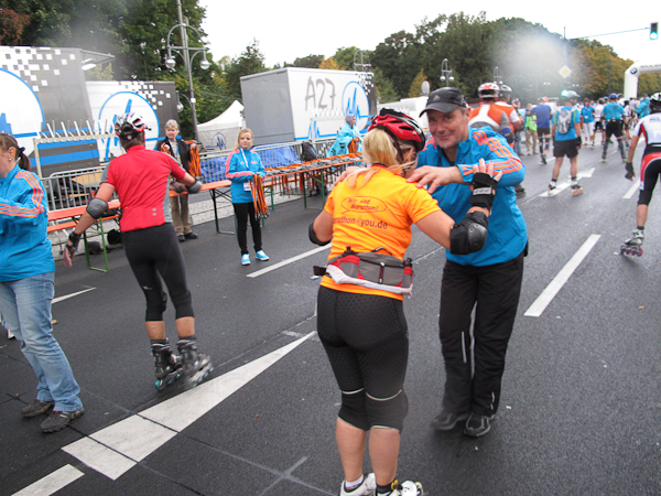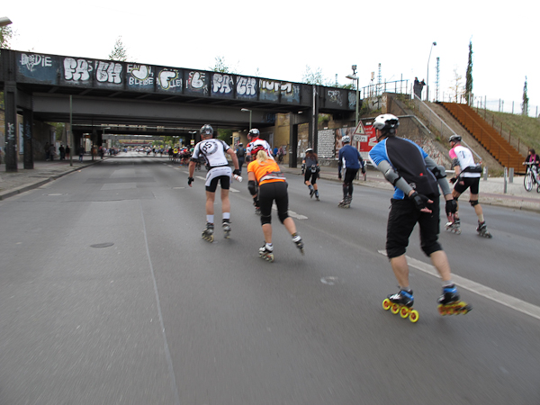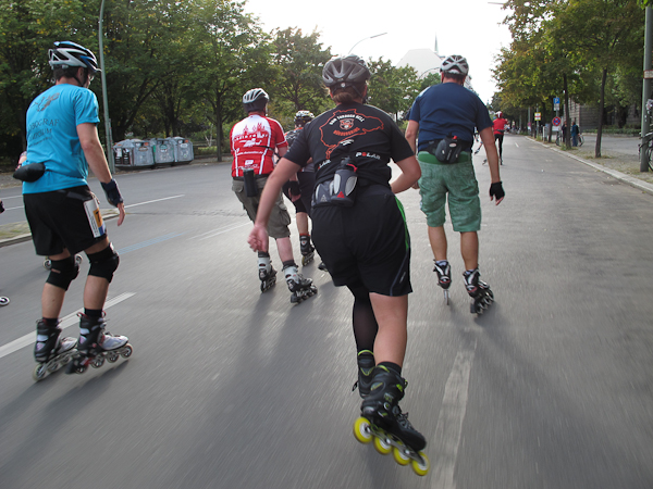 Bei dieser Dauerhöchstgeschwindigkeit überlege ich, wie schön es wäre, so schnell durch Berlin laufen zu können. Zsssss, Kilometer 21 und genügend Kraft, noch mehr Druck zu geben. Zssss, Kilometer 26, ein schneller Richtungswechsel, ich bin im Rollers-High und die Elite schon lange im Ziel. Der Rücken fängt an zu schmerzen und die Pobacken brennen, aber was tut man nicht alles für einen schönen Hintern, denke ich und versuche die Schmerzen zu ignorieren.