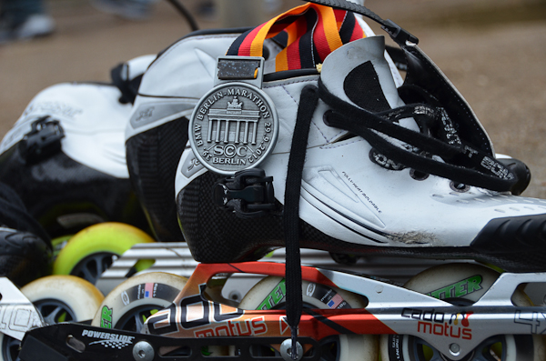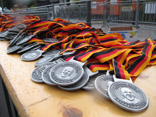 Die Rollen rutschen bei jedem Abdruck weg und das glatte Pflaster verhindert einen eleganten Zieleinlauf. Noch einmal über die Zeitmessmatte mit Bremswirkung und schon rolle ich in die Arme eines Helfers, der mir die Finisher-Medaille umhängt.