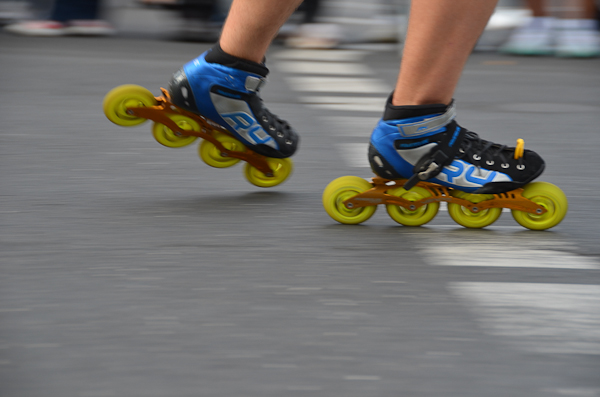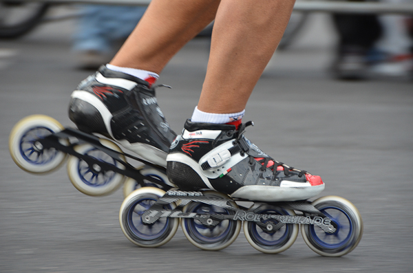 Aber auch die 26 Knochen und über 30 Gelenke mit mindestens ebenso vielen Muskeln und über 100 Bändern, Sehen, Venen, Adern und Nerven an den Füßen, spüre ich. Diese komplizierten und feinfühligen Sinneswerkzeuge lassen mich ganz klar spüren, was sie davon halten, in den knallharten Carbon-Schuhen eingesperrt zu sein. Mein linker Fuß ist taub und mit diesem Schmerz steigt auch die Unaufmerksamkeit. Das Schaulaufen der Skater zieht viele Schaulustige an. „Die wollen nur eins, dich fallen sehen“ denke ich. Plötzlich fahre ich in eine Spurrille und mich überkommt das Gefühl eines herannahenden Sturzes. „Sch…!“ Verzweifelt rudere ich mit den Armen…. – puh, mein Schutzengel muss sportlich sein.