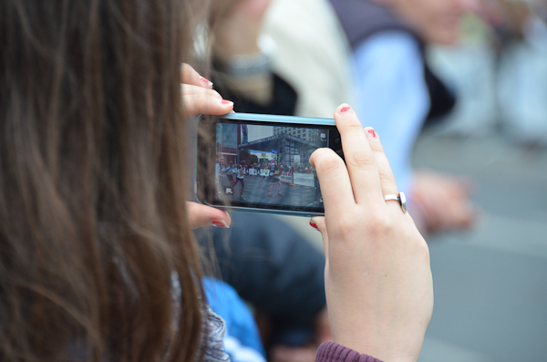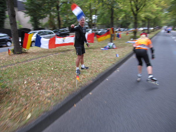 Mit aller Kraft und Glück schaffe ich es, dem schwerkraftbedingten Zug nach unten zu trotzen und nur mit Mühe behalte ich das Gleichgewicht. Nach dieser Panikminute der Unaufmerksamkeit presst sich binnen einer Sekunde ein Schwall Angstschweiß flächendeckend aus meinem Körper. Die vielen Zuschauer am Wilden Eber sind bekannt dafür, den Läufern „Beine zu machen“. Heute tragen sie uns mit Beifall um die Kurve. Von weitem sehe ich schon die Vielläufer Monika und Lothar Preißler uns zujubeln. Im Rausch der Geschwindigkeit will niemand zurückbleiben. Zsssss, „Andrea, Andrea“ inmitten der Zuschauer höre ich Klaus meinen Namen rufen. Bevor ich reagieren kann, sind wir schon vorbeigeflitzt (vielen Dank für das Anfeuern, wir revanchieren uns morgen bei dir).