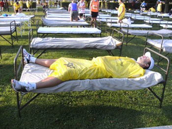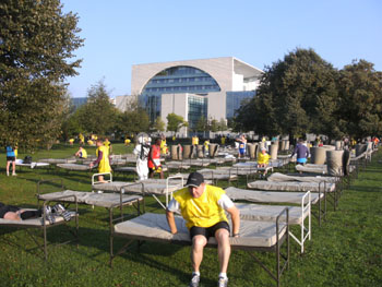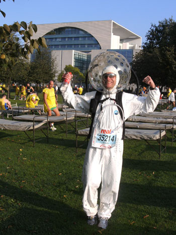 Ich bin überwältigt von den unglaublichen Dimensionen. Auf einer Wiese vor dem Kanzleramt sind Massagebetten aufgebaut. Einzelne Läufer liegen hier und gönnen sich noch letzte Momente der Ruhe. Da treffe ich Claus aus Dänemark. Er steckt in einem Raumanzug und posiert gerne für ein Foto. Nachher im Rennen treffe ich nochmals, er leidet in seinem Anzug stark unter der Hitze. Ein Badeanzug wäre als Verkleidung heute besser dem Wetter angepasst.