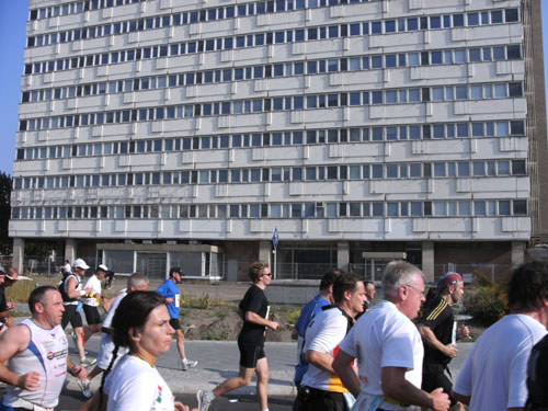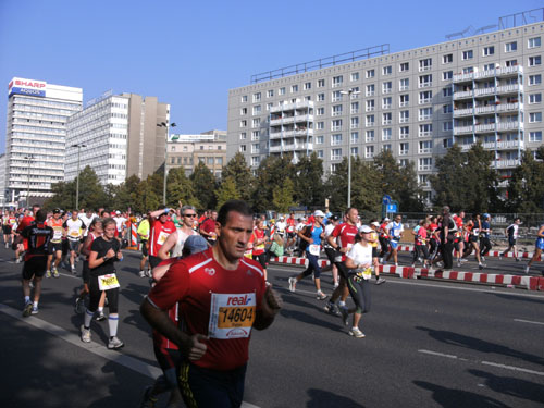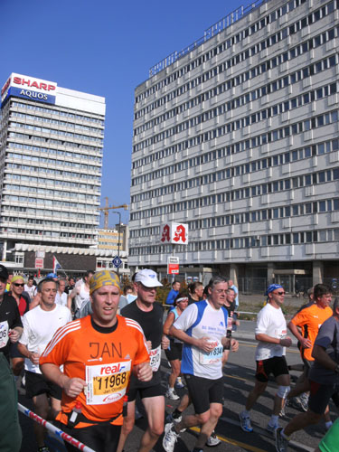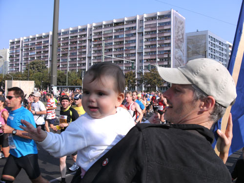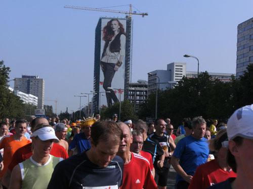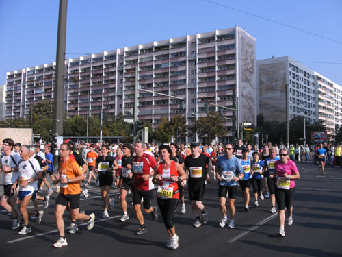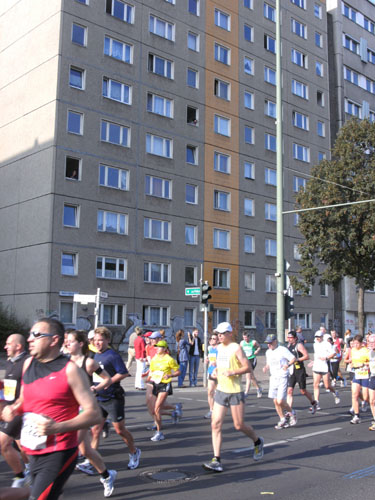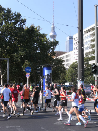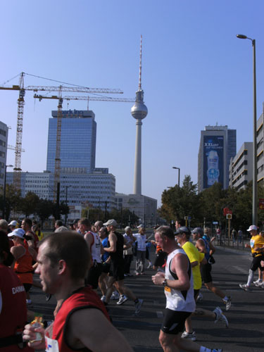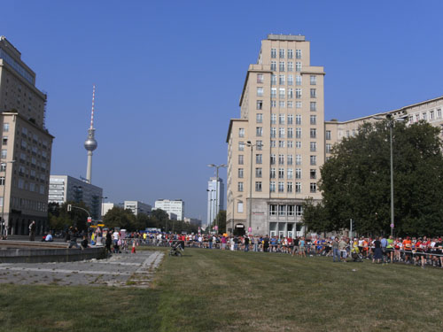 Bei herrlichem Zuschauerwetter geht es weiter in nicht endenden Läufermassen nach Berlin Mitte. Wir laufen in einem großen Bogen um den Alex. Den Fernsehturm sieht man an mehreren Stellen weithin zwischen den Plattenbauten in den Himmel ragen. Wir sind im ehemaligen Ostteil der Stadt, an den charakteristischen Plattenbauten eindeutig zu erkennen.