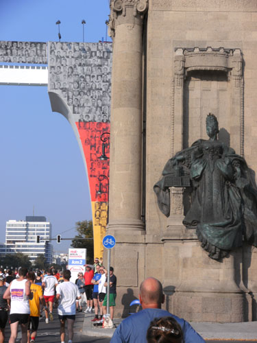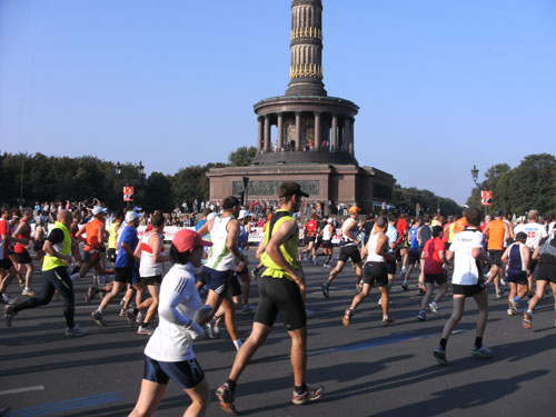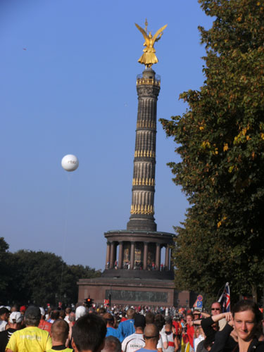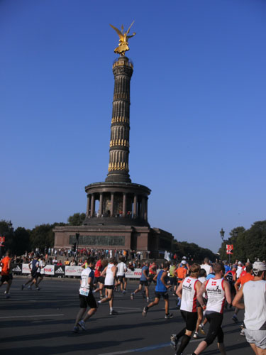 Vom Start auf der Straße des 17. Juni aus hat man einen tollen Blick zur Siegessäule. Die Massen umlaufen die seit 1938/39 auf dem Großen Stern inmitten des Großen Tiergartens befindliche 1864-1873 erbaute Säule zu beiden Seiten des großen Kreisverkehrs. Oben auf der Spitze trägt die Säule die im Berliner Volksmund Goldelse genannte Viktoria, eine über 8 m hohe Statue mit 35 Tonnen Gewicht. Die Goldelse wird ihren Namen gerecht und scheint schon von weitem sichtbar golden in der Sonne.