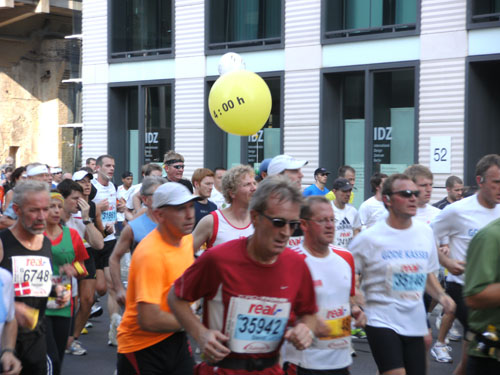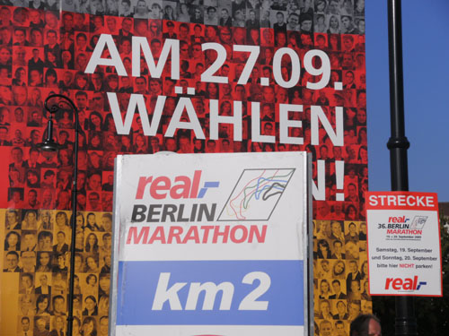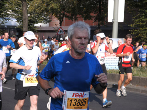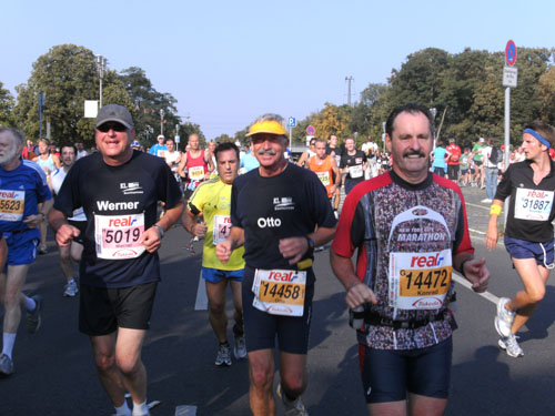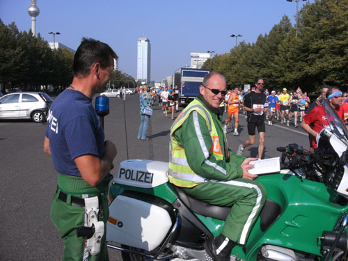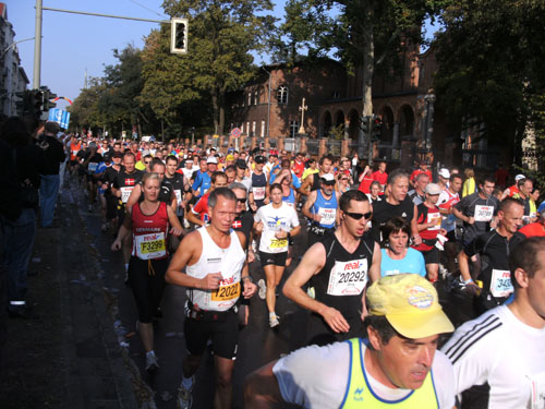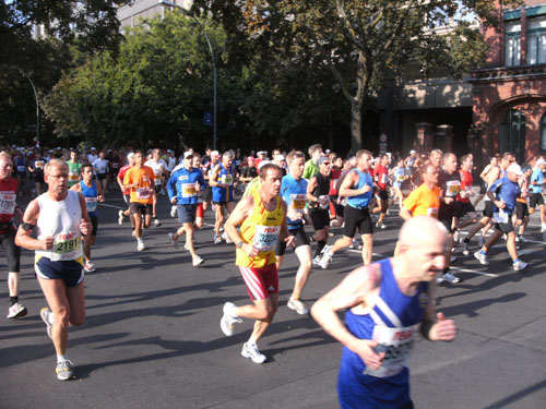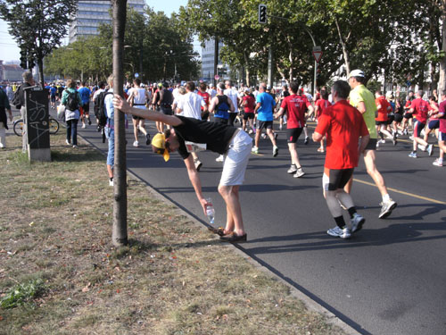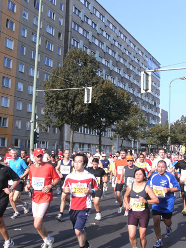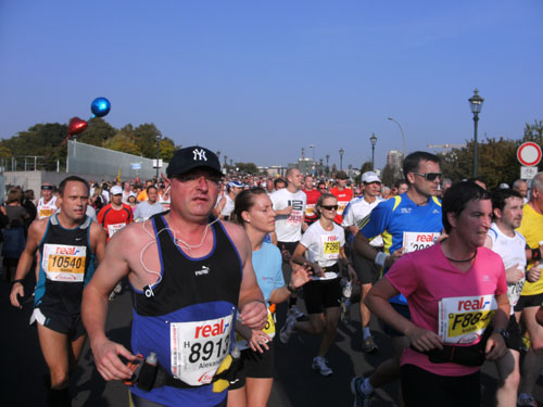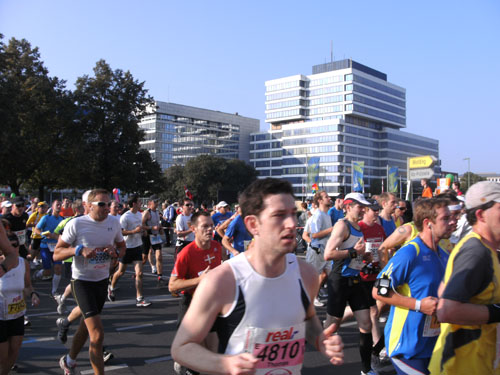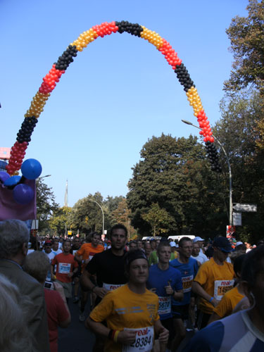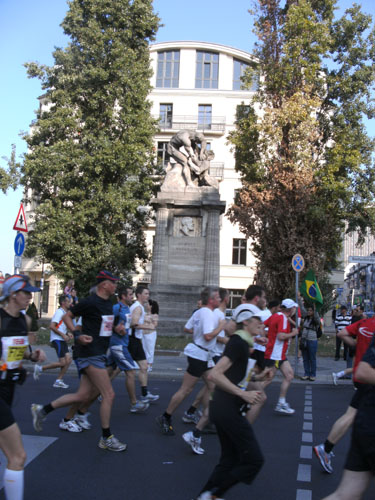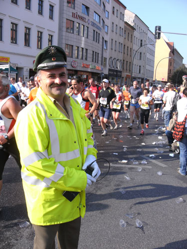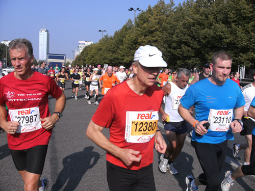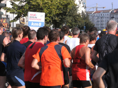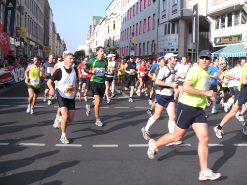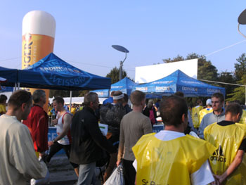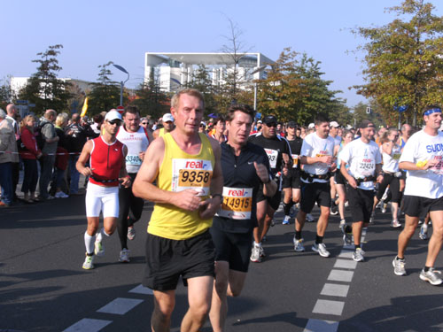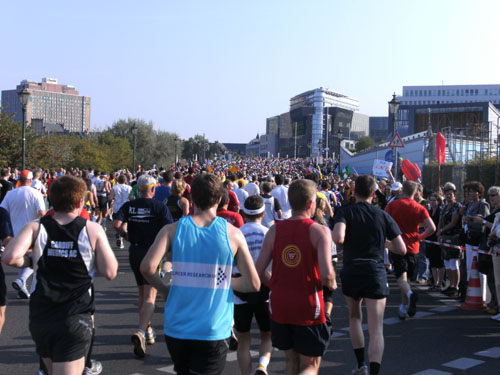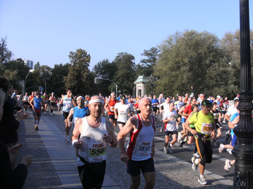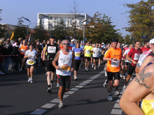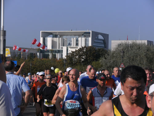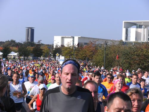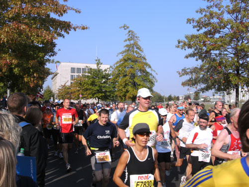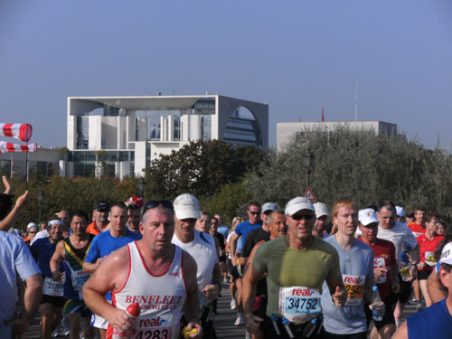 Ich bin mit Michael, einem Kollegen aus Bonn, am Seiteneingang des Kanzleramtes verabredet. Für ihn ist das Treffen wichtig, habe ich doch seine Startnummer. Nach mehreren Telefonaten treffen wir uns auch wirklich um 8 Uhr. Ich kann Michael gerade noch die Startnummer und den Kleiderbeuten geben, da ist er auch schon im Gedränge verschwunden. „Der große Vorsitzende“, so Michaels liebevolle Bezeichnung durch die Kollegenschaft, wird seinen ersten Marathon mit Bravour bestehen und locker nach 4.32 Std. im Ziel einlaufen. Sein Problem besteht vor dem Start jedoch darin, rechtzeitig in den Startblock zu kommen.