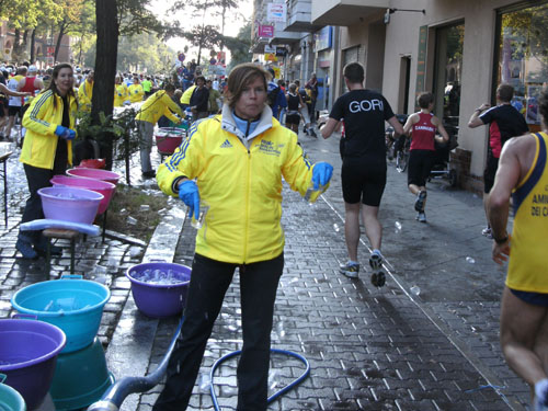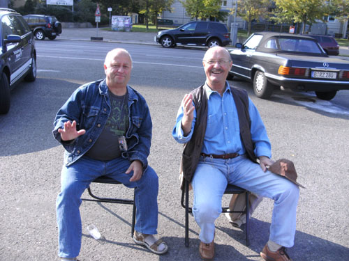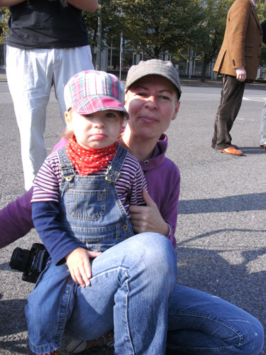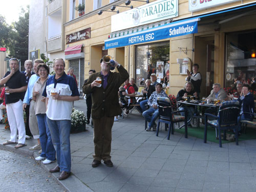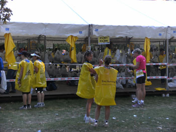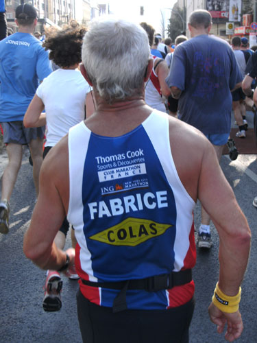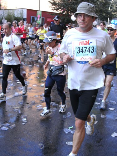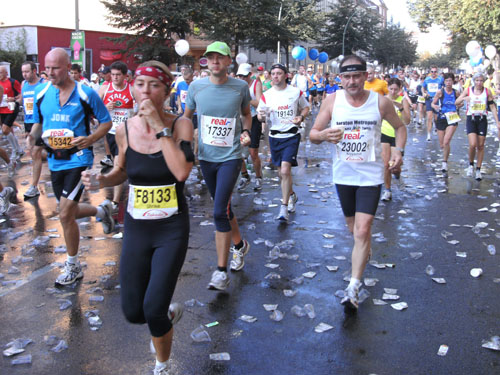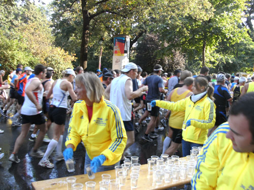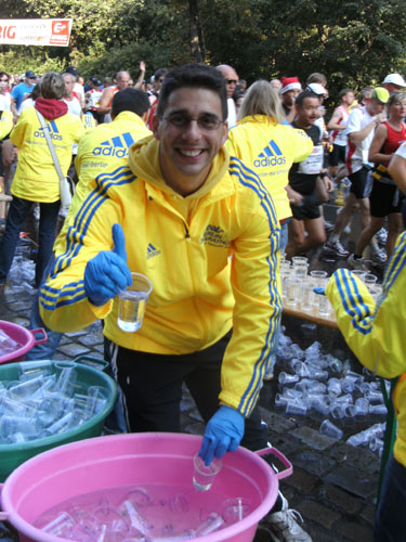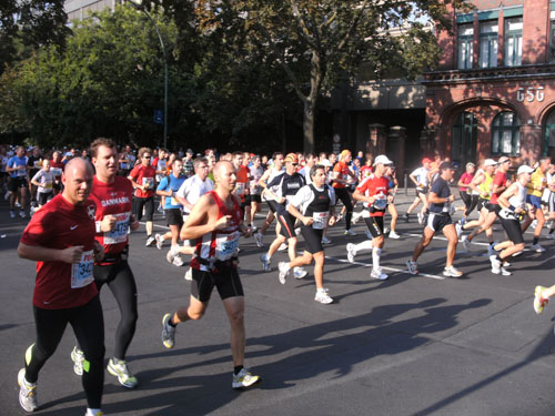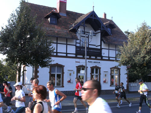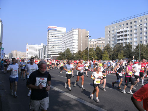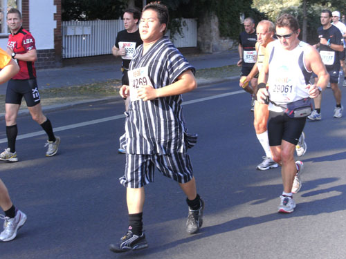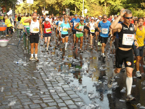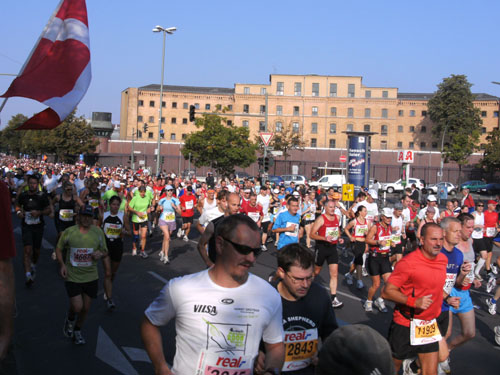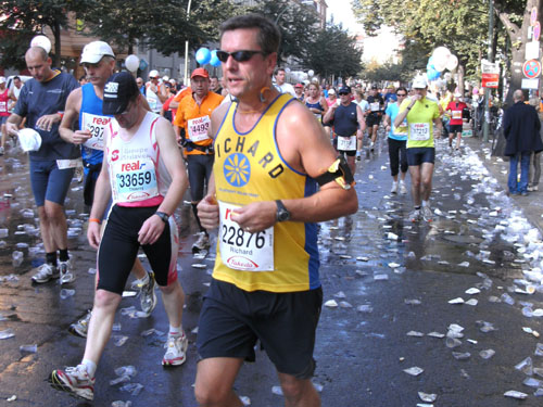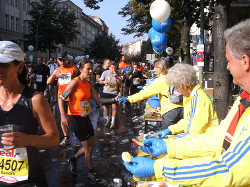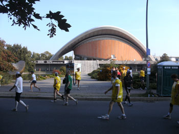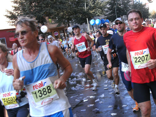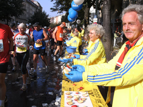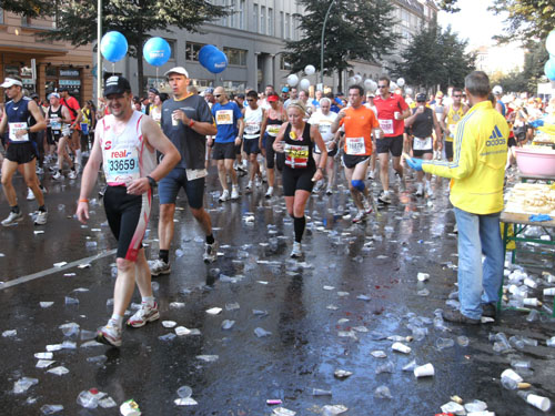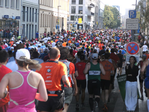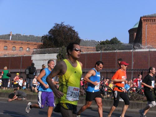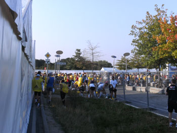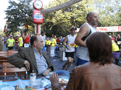 Ich bin mit Michael, einem Kollegen aus Bonn, am Seiteneingang des Kanzleramtes verabredet. Für ihn ist das Treffen wichtig, habe ich doch seine Startnummer. Nach mehreren Telefonaten treffen wir uns auch wirklich um 8 Uhr. Ich kann Michael gerade noch die Startnummer und den Kleiderbeuten geben, da ist er auch schon im Gedränge verschwunden. „Der große Vorsitzende“, so Michaels liebevolle Bezeichnung durch die Kollegenschaft, wird seinen ersten Marathon mit Bravour bestehen und locker nach 4.32 Std. im Ziel einlaufen. Sein Problem besteht vor dem Start jedoch darin, rechtzeitig in den Startblock zu kommen.
