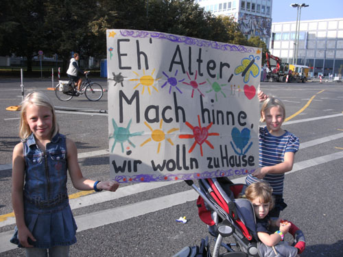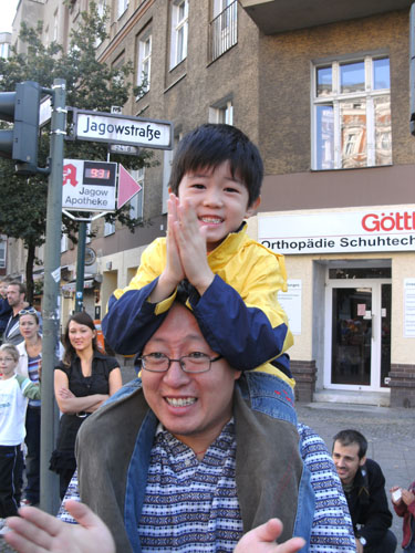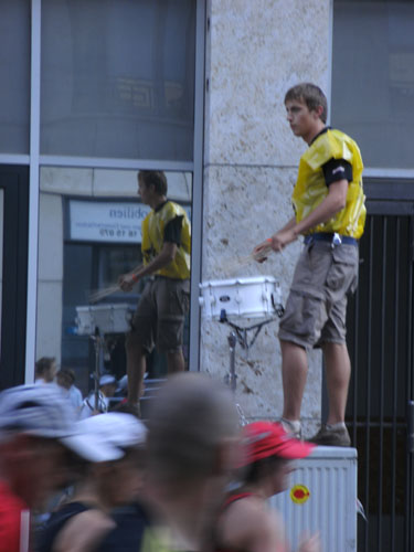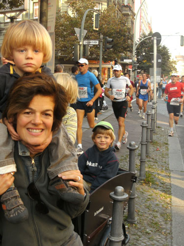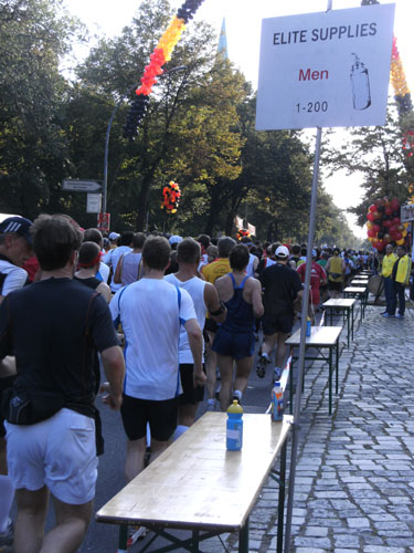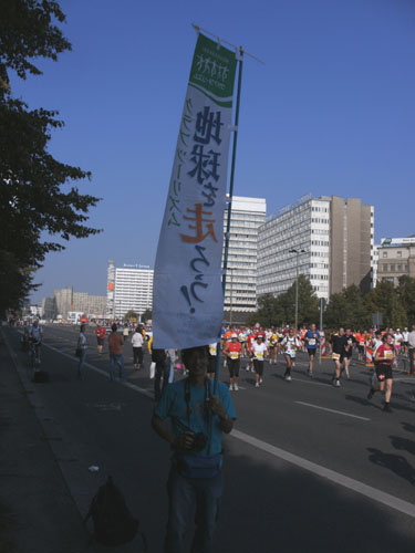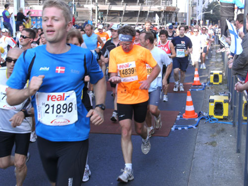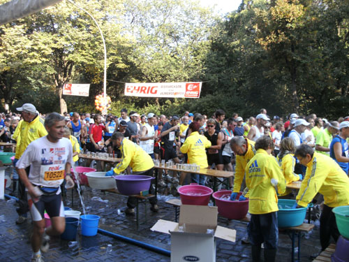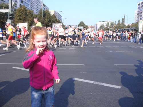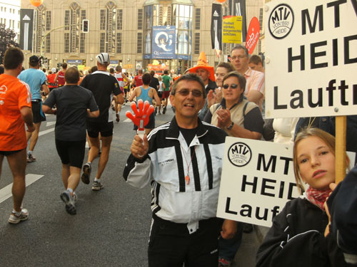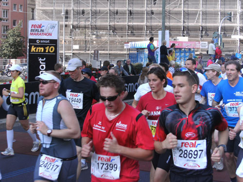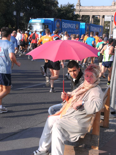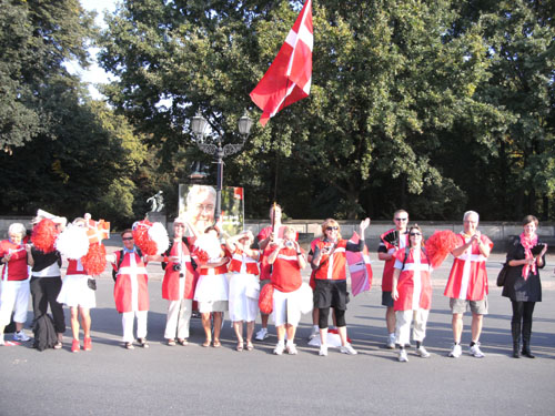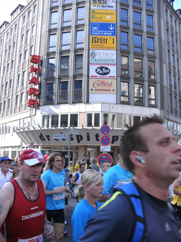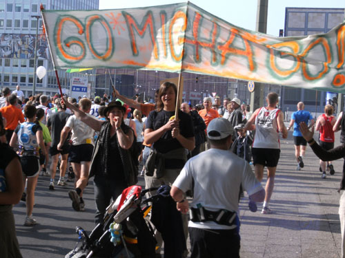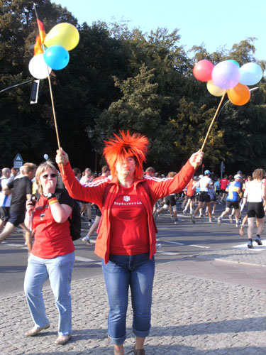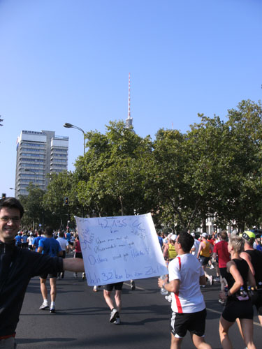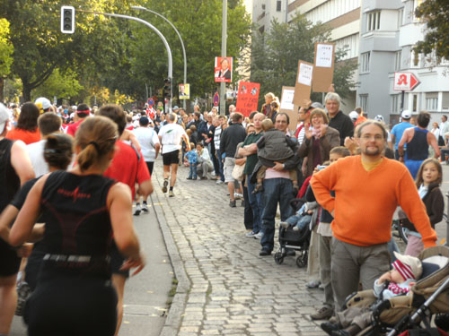 Unten am Platz fallen mir die ersten Dänen auf. Sowohl unter den Läufern, als auch unter den Zuschauern am Rande. Mit etwa 6.000 Startern stellt Dänemark das größte Kontingent der ausländischen Läufer. Berlin dürfte damit der größte dänische Marathon sein. Auch am Rande machen die Dänen reichlich Stimmung, Danish dynamite.
