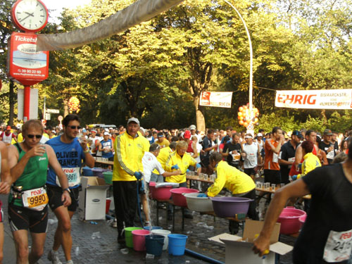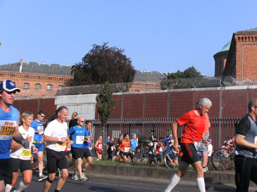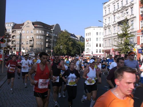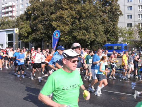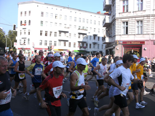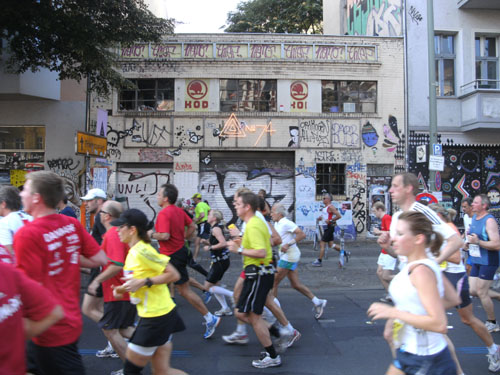 Am Strausberger Platz geht es nun vorbei am Kottbusser Tor durch Neukölln. Es folgt der Südstern und wir sind mitten in Kreuzberg, wo die Nächte bekanntlich lang sind. Es sind noch immer Massen an Läufern um mich herum. Aber alles geht friedlich ab, obwohl man noch immer nicht viel Platz um sich herum hat. An einigen Stellen verengt sich die Strecke, Staus gibt es aber keine. Aber eine deutliche Verteilung der Läufer und Auseinanderziehen des Feldes setzt erst später ein.