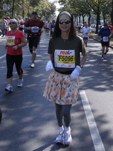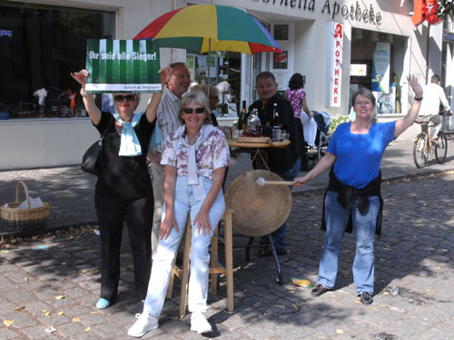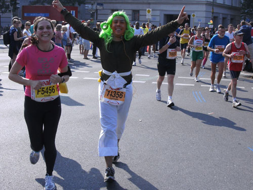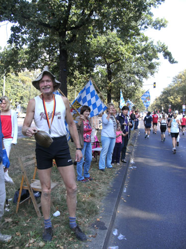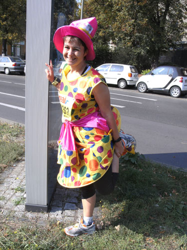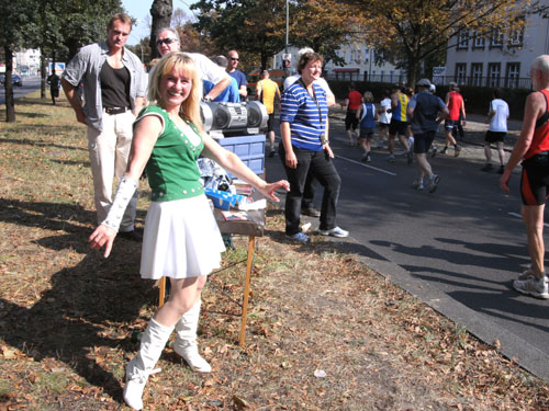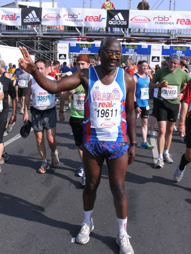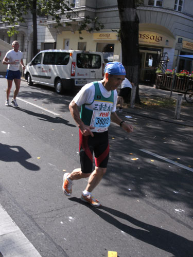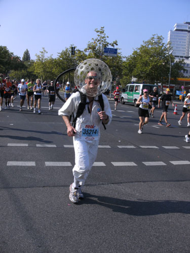 Eine Verkleidung sehe ich in Berlin dieses Jahr bereits zum dritten Male. Es ist der freundliche Franzose Michel Descombes, diesmal allerdings anders als in Hamburg ohne Baguette laufend. Ob er es in Berlin schon gegessen hatte?