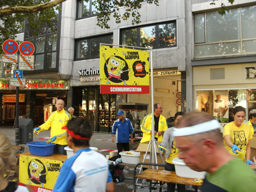 Verkleidungen der Läufer gibt es im Vergleich zu Köln wenige zu sehen. Drei Läufer mit einem kleinen Stoffhund fallen aber allen Läufern und Zuschauern auf: Asterix, Obelix und ein Römer. Sie sind in Originalkleidung unterwegs, Obelix also standesgemäß mit Hinkelstein auf dem Rücken. Die drei sorgen mächtig für Stimmung. An jeder Kilometermarke bleiben sie stehen und machen ein Beweisfoto.