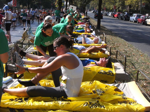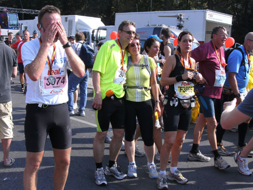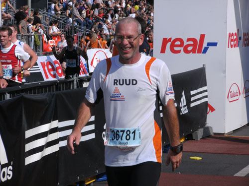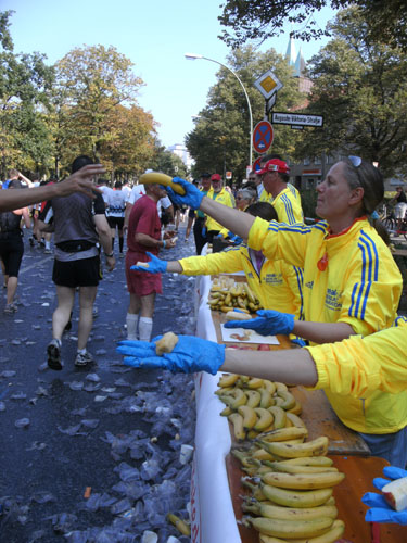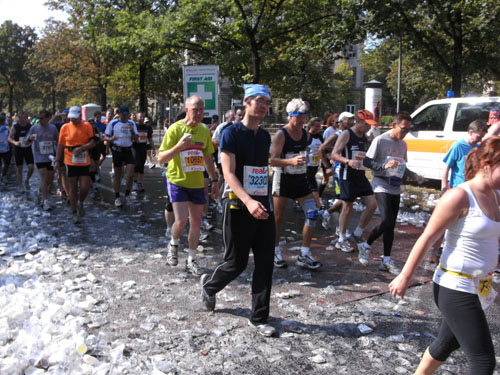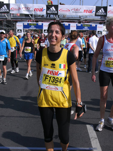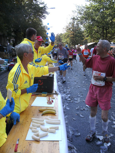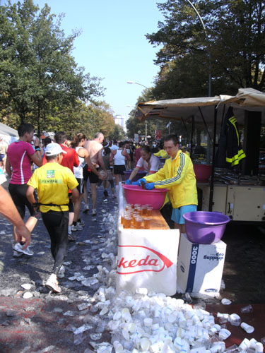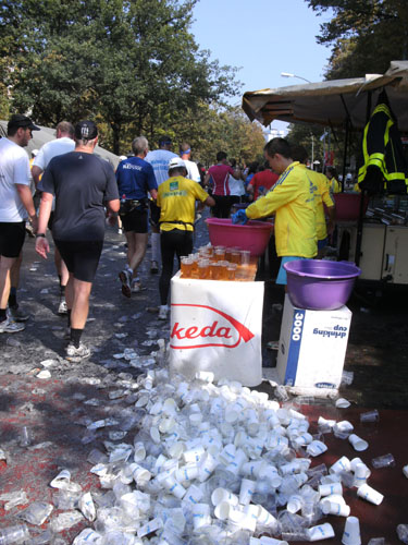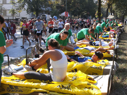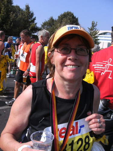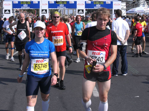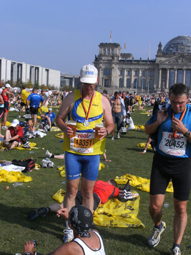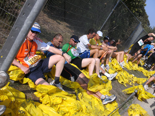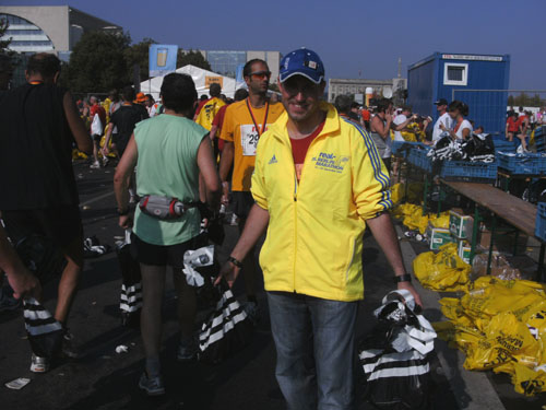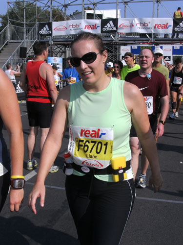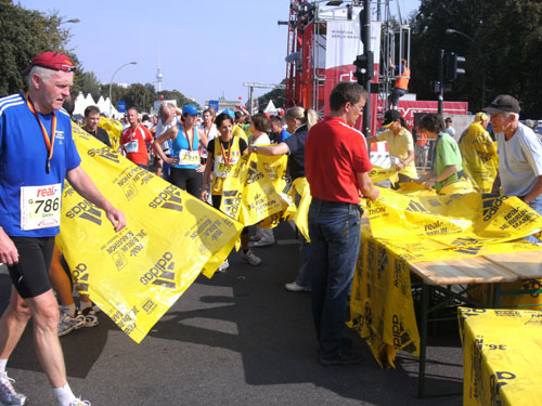 Nach dem Ziel gibt es für alle Finisher die verdiente Medaille mit dem Konterfei des letztjährigen und auch diesjährigen Gewinners Haile Gebrselassie. Wer friert (bei dem Wetter?) bekommt eine Wärmefolie angeboten, über die man dann auf dem Weg zum Alkoholfreien und der Kleiderausgabe stolpern kann. Trotz der Masse ist im Zielbereich alles wohl organisiert. Es gibt Getränke, jeder erhält einen Verpflegungsbeutel.